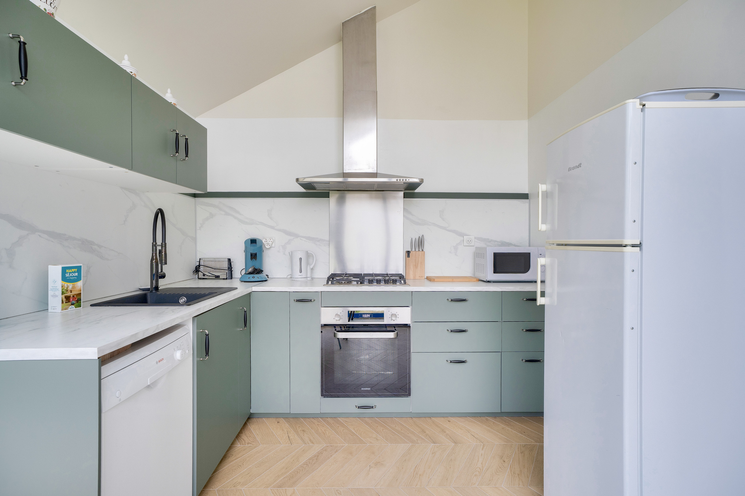 Au rez-de-chaussée, on découvre un beau salon-salle à manger avec des murs verts et blancs, et des jolis meubles en bois. Un canapé confortable et deux jolis fauteuils invitent à prendre place autour de la table basse pour des apéritifs conviviaux ou des parties de jeux de société. Une grande table ovale vous permettra de vous réunir autour des bons repas, préparés avec soin dans la cuisine adjacente. Indépendante et toute équipée, vous y trouverez une plaque de cuisson au gaz, un four traditionnel et un micro-ondes, un réfrigérateur, un congélateur et un lave-vaisselle. Pour vos petits déjeuners, une bouilloire, un grille-pain et une cafetière à capsules Nespresso sont à votre disposition. Ce niveau se complète par une salle d’eau avec une petite douche et un WC sous l’escalier.