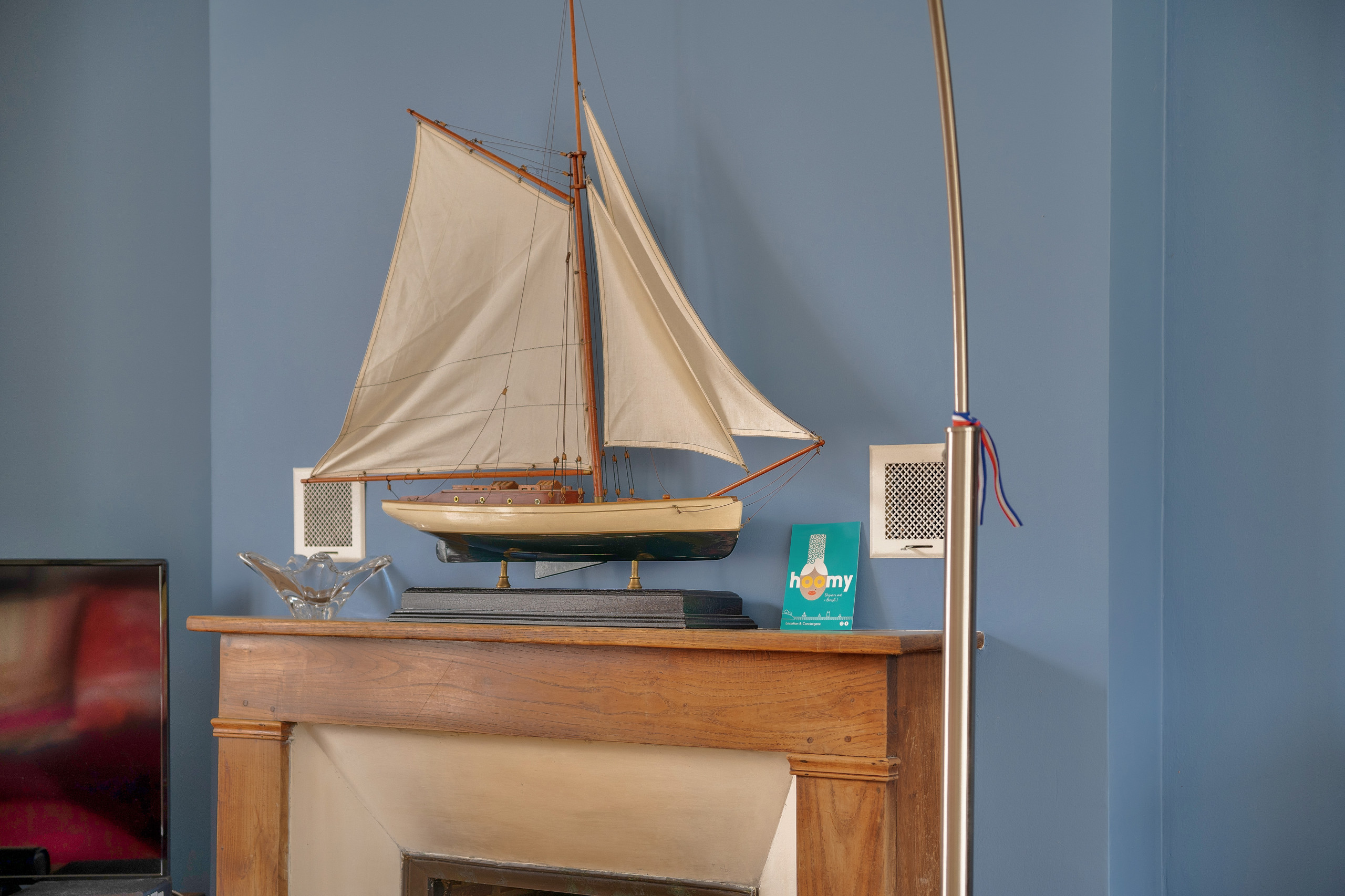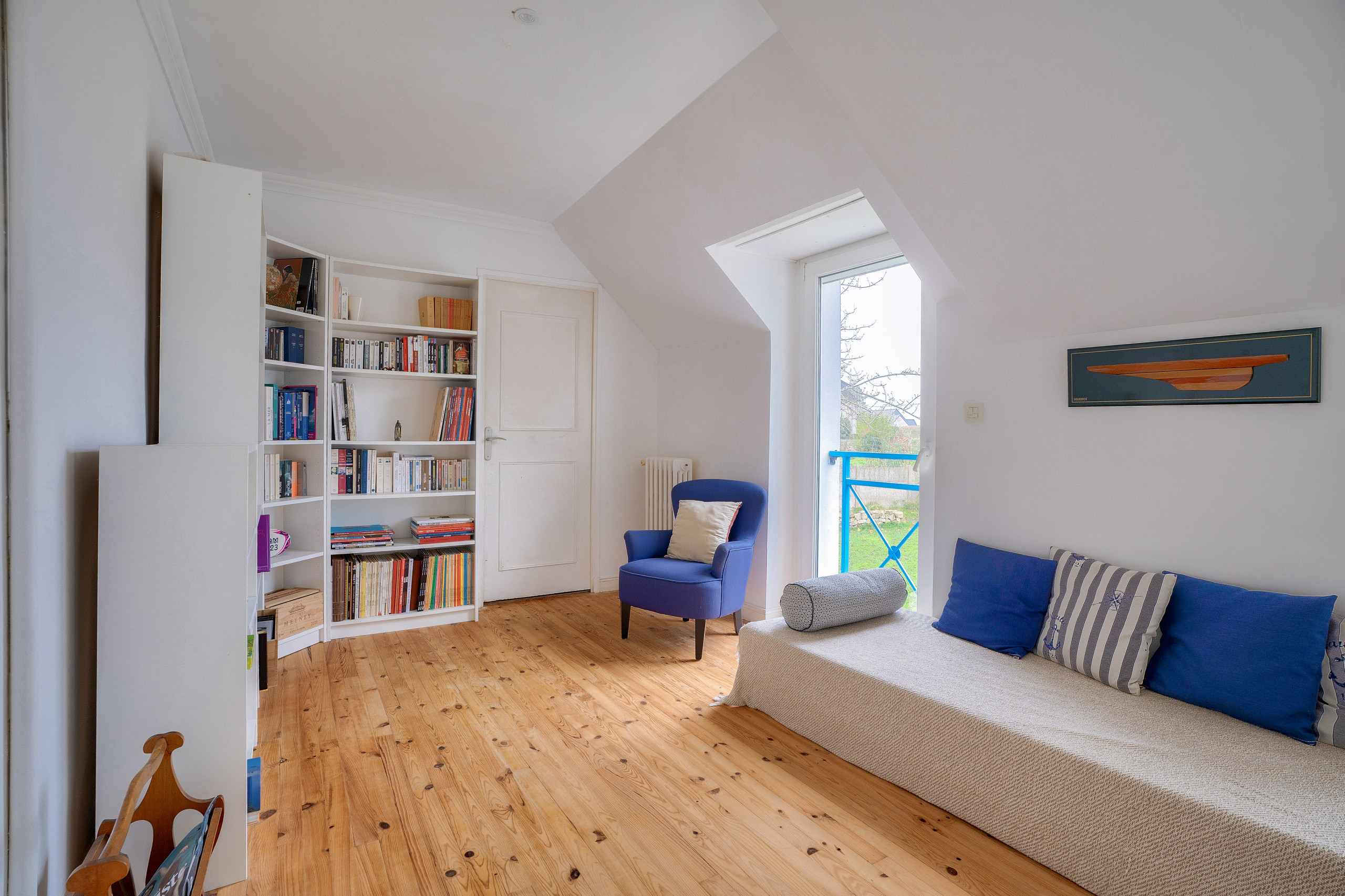 Lorsque vous pousserez sa porte bleue, vous serez tout de suite plongés dans une ambiance de bord de mer, à travers des objets décoratifs et cette couleur bleue, qui est le « fil rouge » de la maison.