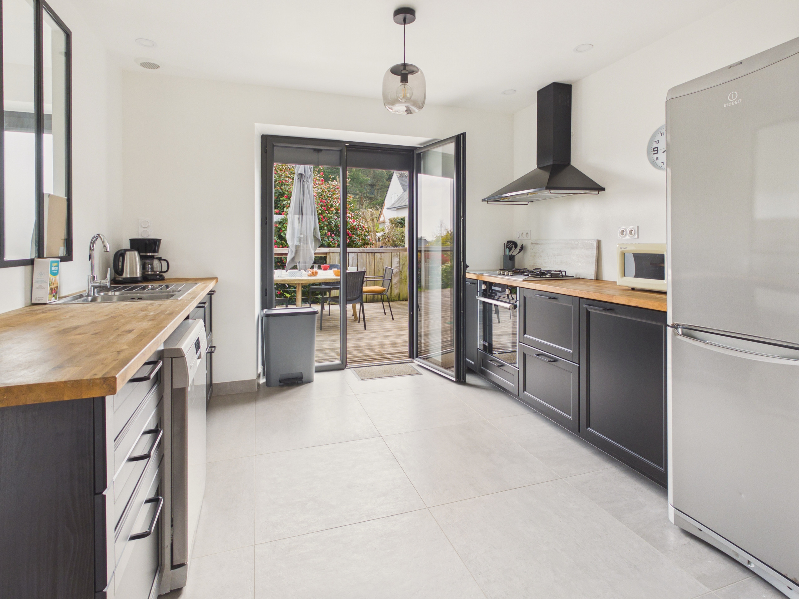 L'intérieur de la maison, très lumineux et à la décoration épurée, saura également vous séduire. Vous y trouverez une cuisine américaine moderne et totalement équipée avec des plaques à induction, un réfrigérateur, un congélateur, un micro-ondes, une cafetière à filtre, un grille-pain et une bouilloire. Elle est ouverte sur la salle à manger, où vous pourrez partager les délicieux repas concoctés sur la grande table. Enfin, vous pourrez passer les soirées plus fraîches dans le salon avec son mur bleu et vous retrouver en famille pour bavarder, regarder la télévision ou jouer à un jeu de société.