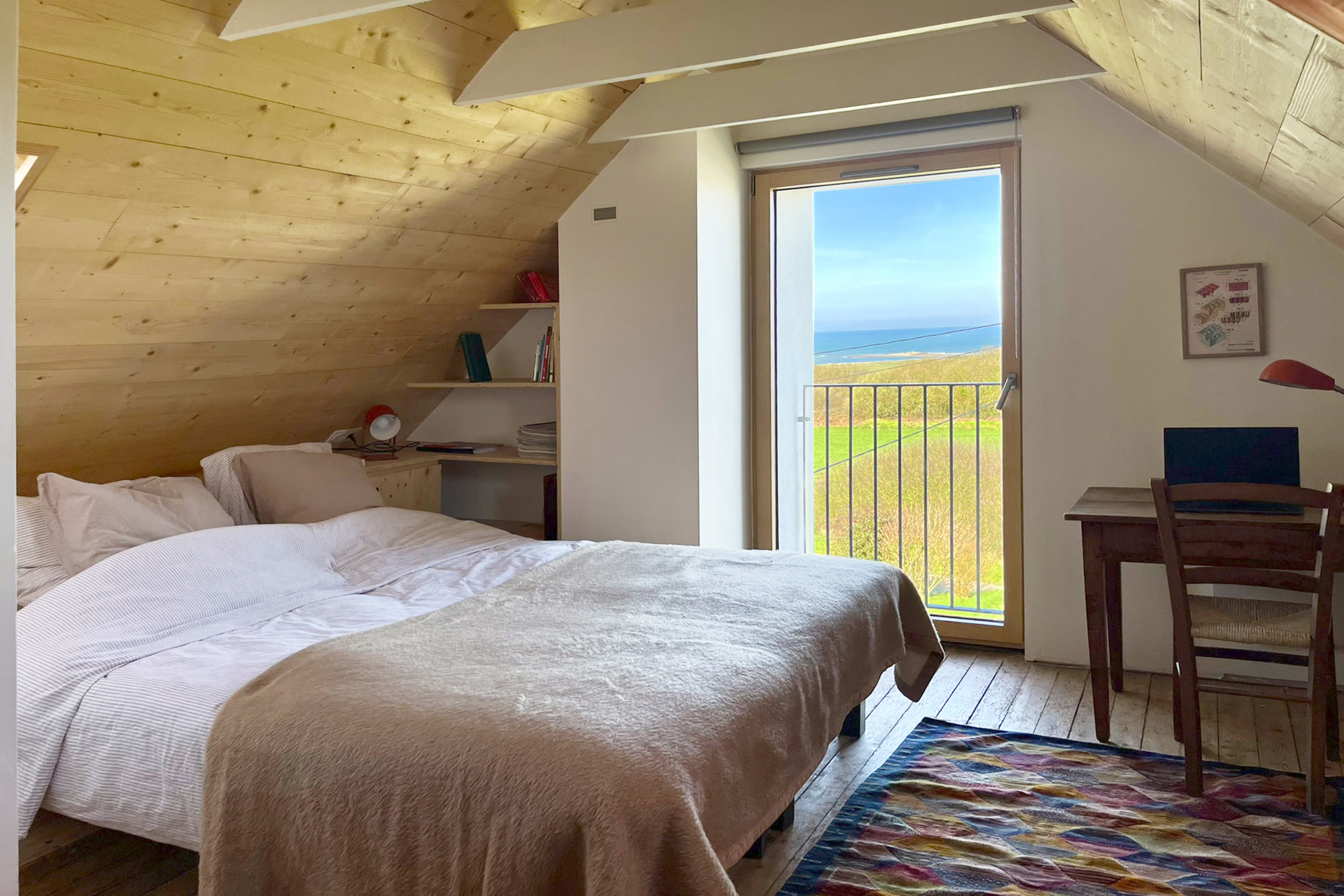 Chambre 3 – 2ème étage semi-ouverte : un lit Queen Size (160x200 cm) et une superbe vue sur la mer.