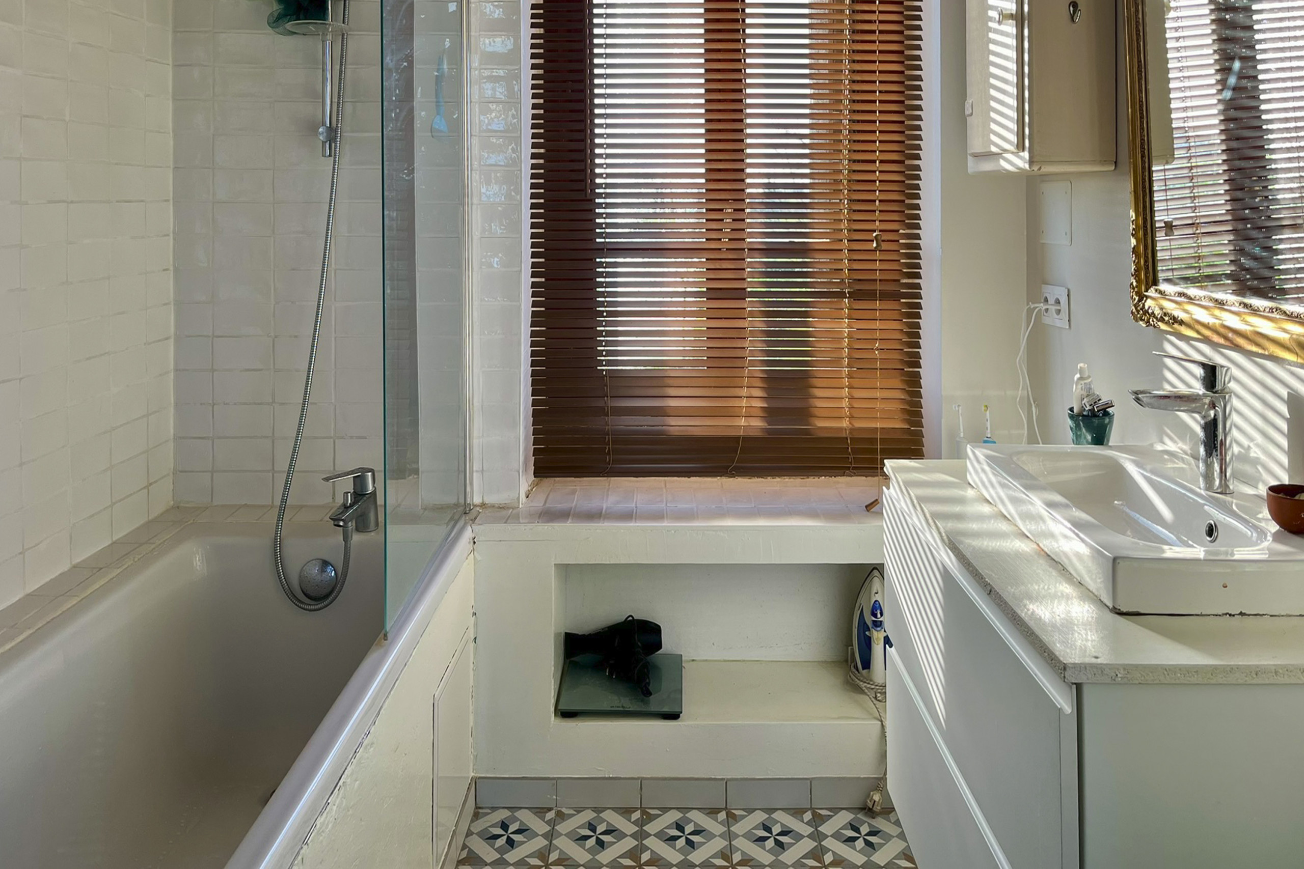 Au 1er étage, vous trouverez également un vaste espace avec deux bureaux dédiés au télétravail (2 écrans à disposition) ou aux jeux et activités créatives en famille, une SDB avec baignoire (équipée d’un sèche-cheveux et d’un sèche serviette).