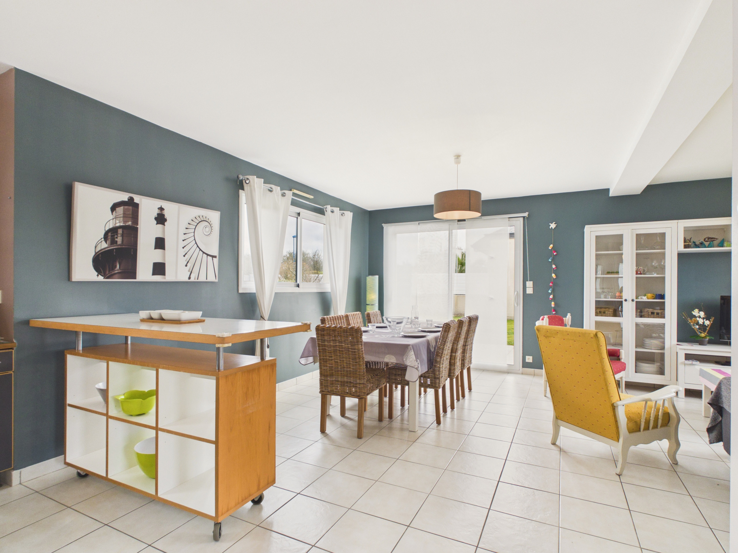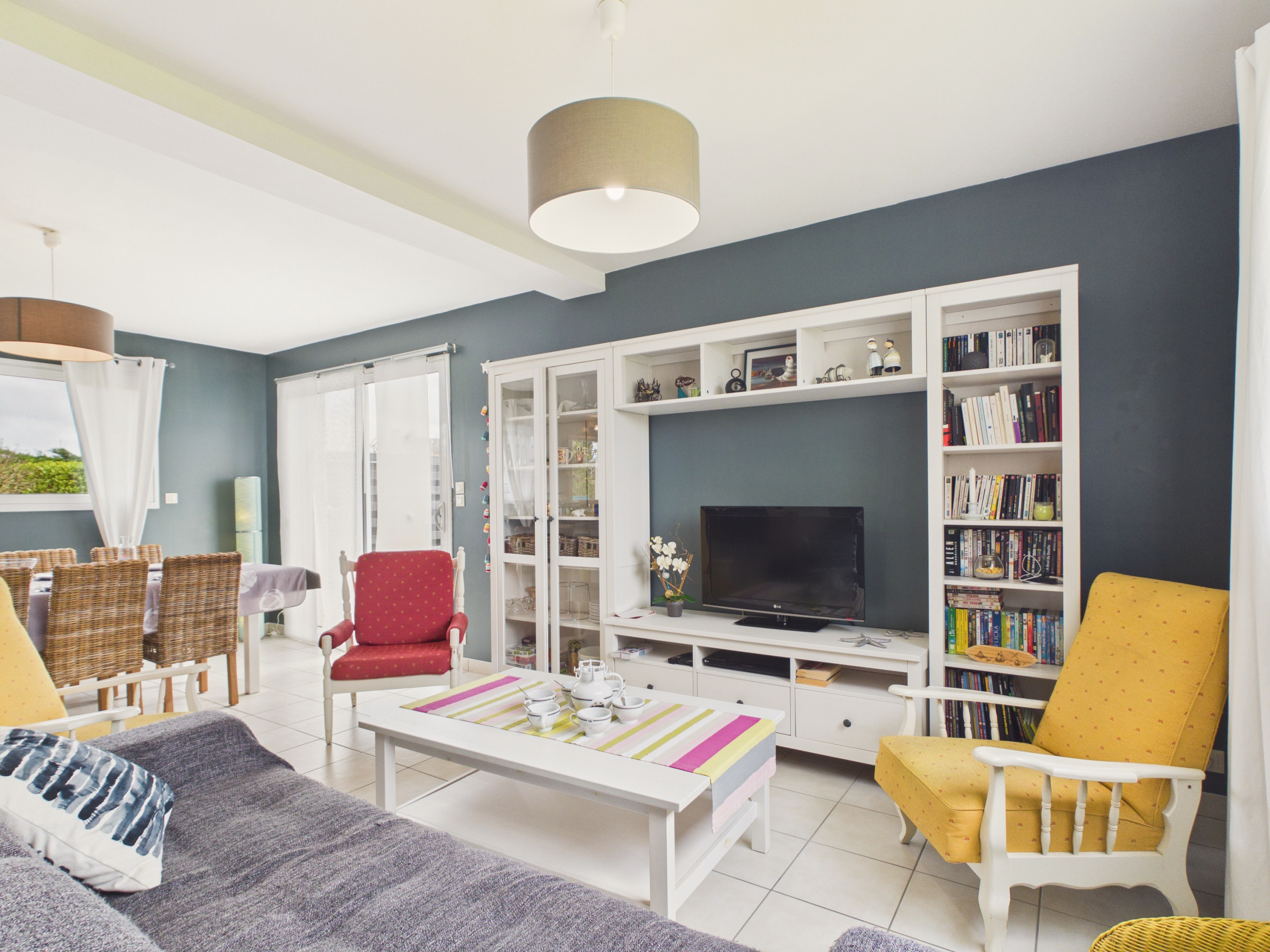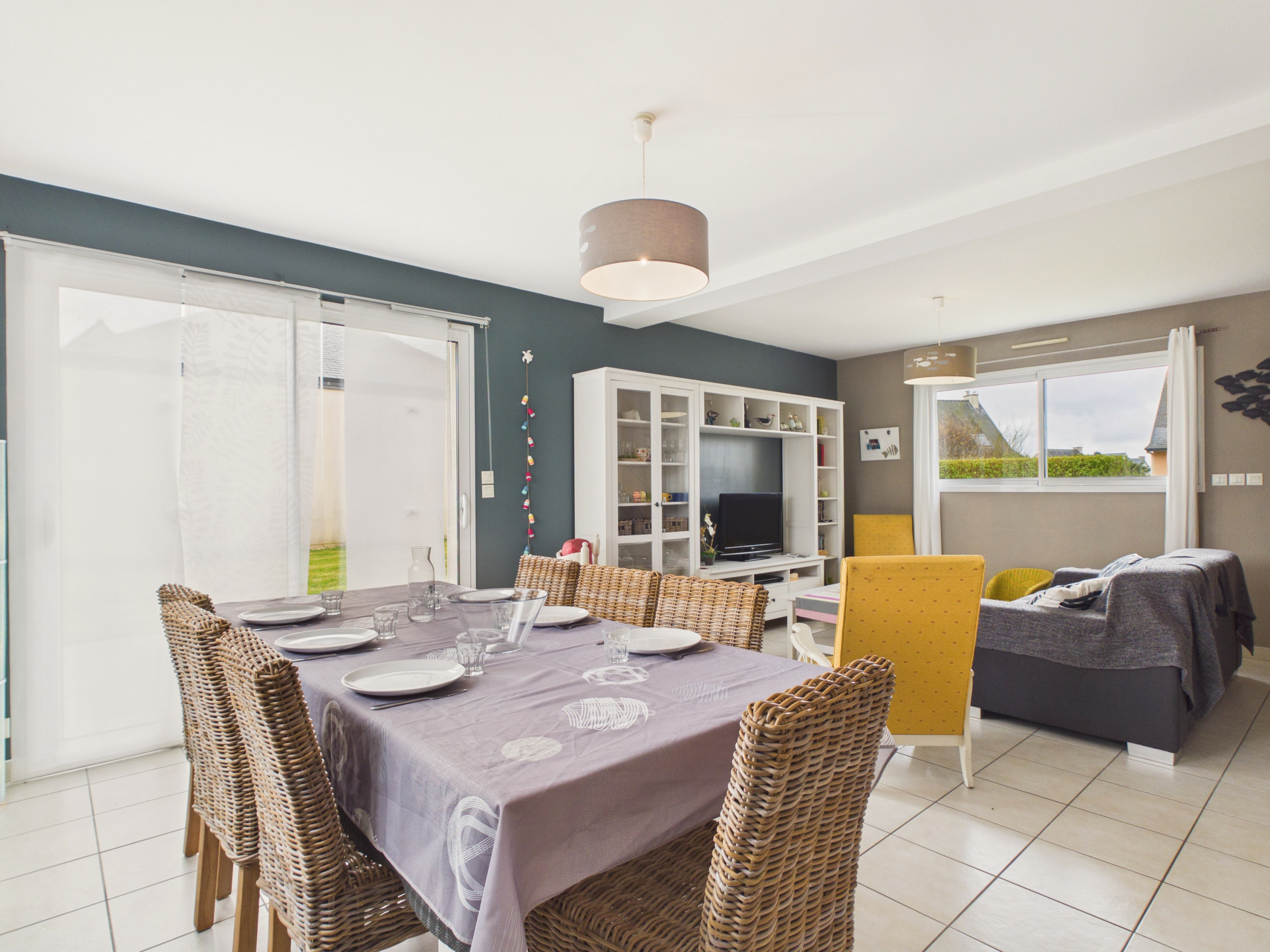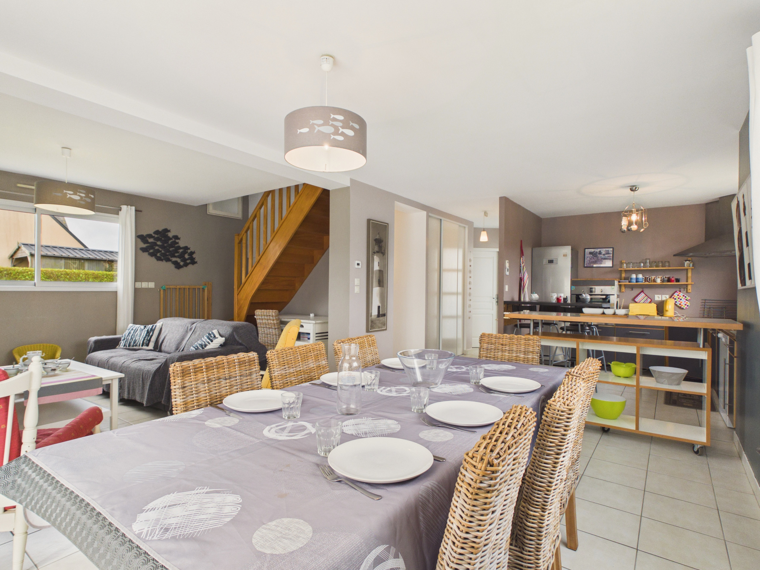 Traversez la cour puis ouvrez la porte d’entrée et découvrez une grande pièce à vivre. La cuisine ouverte, moderne et entièrement équipée (réfrigérateur, congélateur, four, micro-ondes), vous permettra de préparer de délicieux repas. Pour vos petits-déjeuners, cafetière à filtre, bouilloire et grille-pain sont à disposition. Partagez vos repas autour de la table pour 6 personnes, ou profitez de la terrasse et de son barbecue lors des beaux jours. Le salon, avec canapé, fauteuils, table basse et télévision, est parfait pour des soirées détentes.