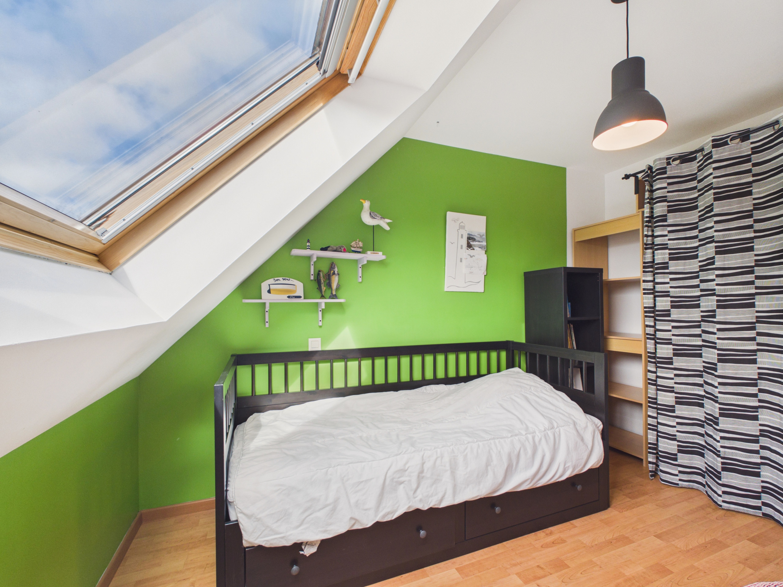 - Chambre 3 (étage) : un lit simple (80x190) avec tiroir pouvant se transformer en lit Queen Size (160x190)