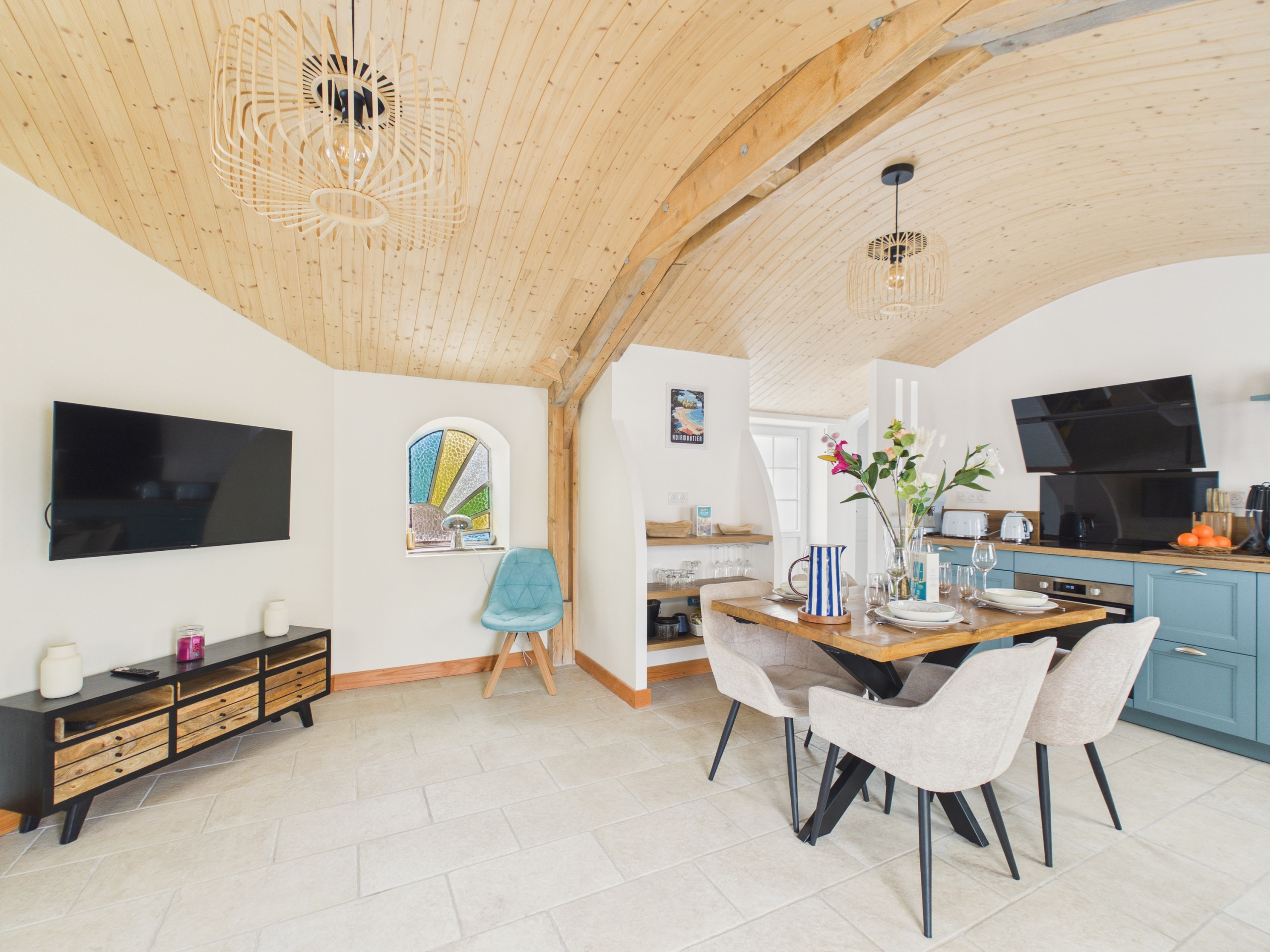 À l’intérieur, vous découvrirez dès l’entrée une belle pièce de vie chaleureuse et lumineuse. Le salon, composé d’un canapé confortable et d’une télévision, s’ouvre sur le jardin grâce à une grande baie vitrée qui apporte une belle lumière naturelle. Le plafond, superbement travaillé en bois clair arrondi, évoque une vague ou une coque de bateau et confère à l’ensemble un charme unique. L’espace salle à manger, situé de l’autre côté de la pièce, dispose d’une grande table pouvant accueillir jusqu’à 6 personnes pour des moments conviviaux. La cuisine américaine ouverte, à induction, est entièrement équipée : réfrigérateur, four, micro-ondes, lave-vaisselle, cafetière Expresso et Senseo, grille-pain, bouilloire et tout le nécessaire pour cuisiner comme à la maison.
