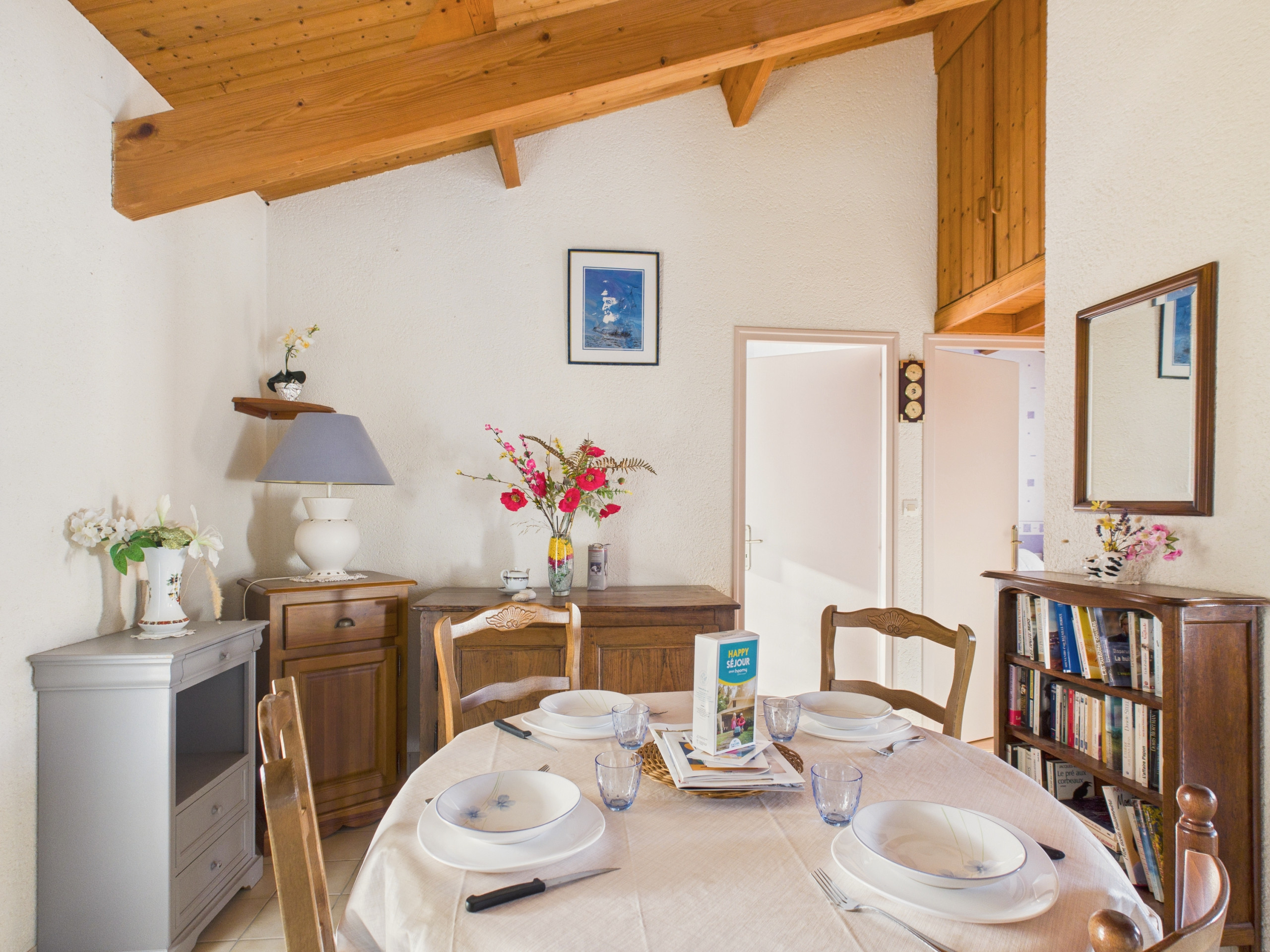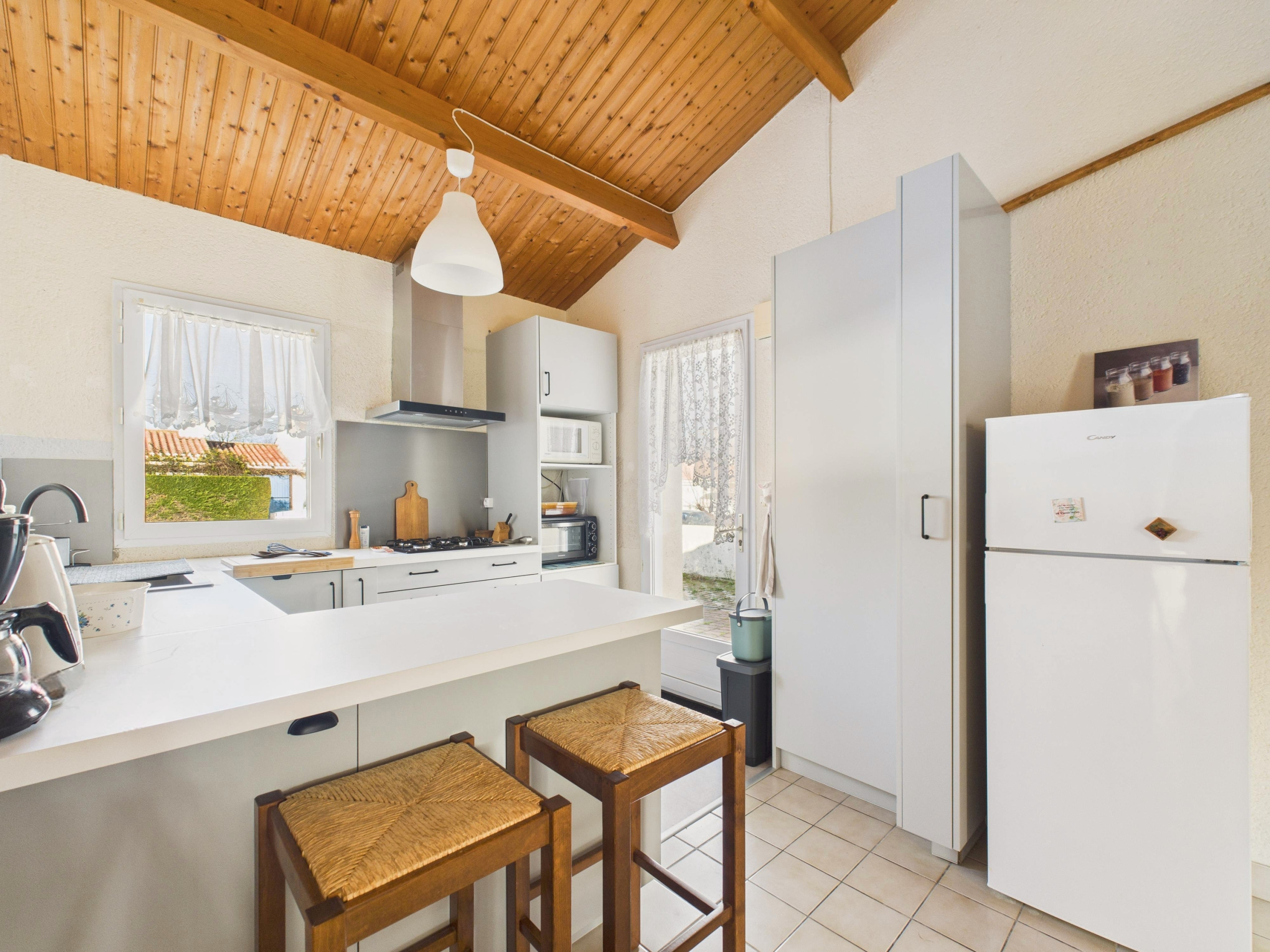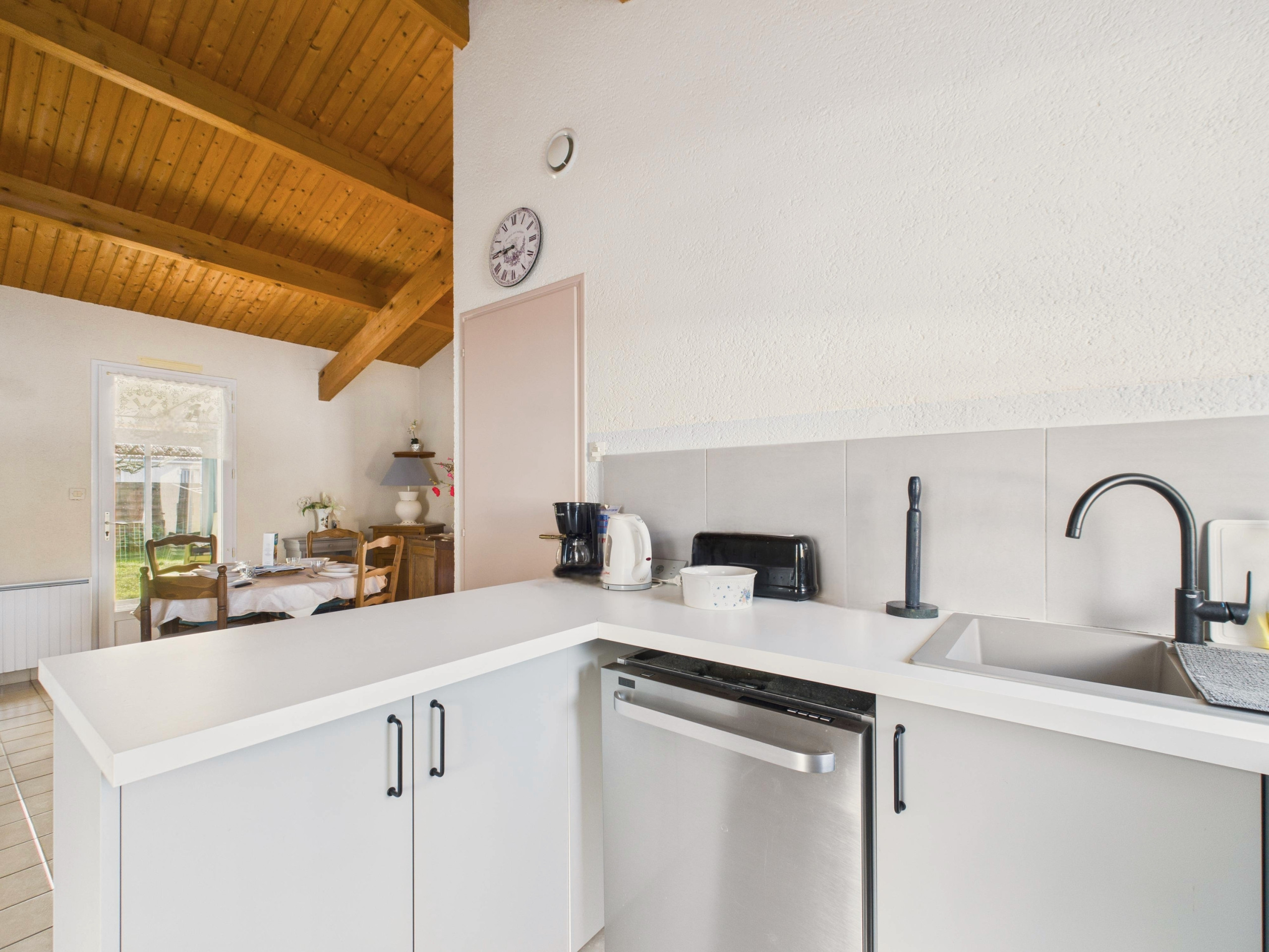 Dès l’entrée, vous serez séduit par la pièce principale conviviale. On y découvre une cuisine américaine fonctionnelle et bien équipée : plaques de cuisson à gaz, réfrigérateur, congélateur, four, micro-onde, lave-vaisselle, cafetière filtre et italienne, grille-pain, bouilloire, friteuse ainsi que tous les ustensiles nécessaires à la préparation de vos repas. Cette cuisine s’ouvre directement sur une salle à manger chaleureuse dotée d’une télévision, parfaite pour partager de bons moments en famille.