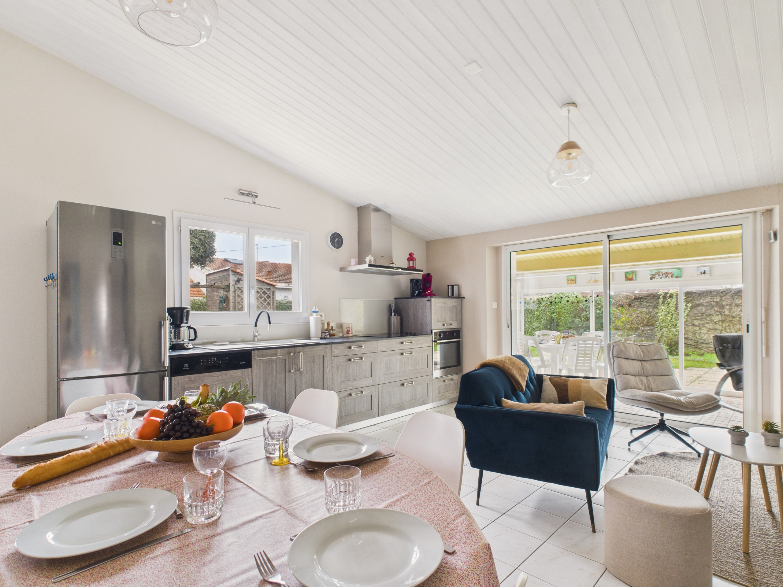 La maison est joliment aménagée dans des tons bois et avec des touches bord de mer. La cuisine est moderne et entièrement équipée (plaque à induction, réfrigérateur, micro-ondes, four, congélateur, lave-vaisselle, cafetière Nespresso, grille-pain, et bouilloire). La salle à manger, conviviale et lumineuse, est parfaite pour se réunir autour de bons plats et de moments de rire.