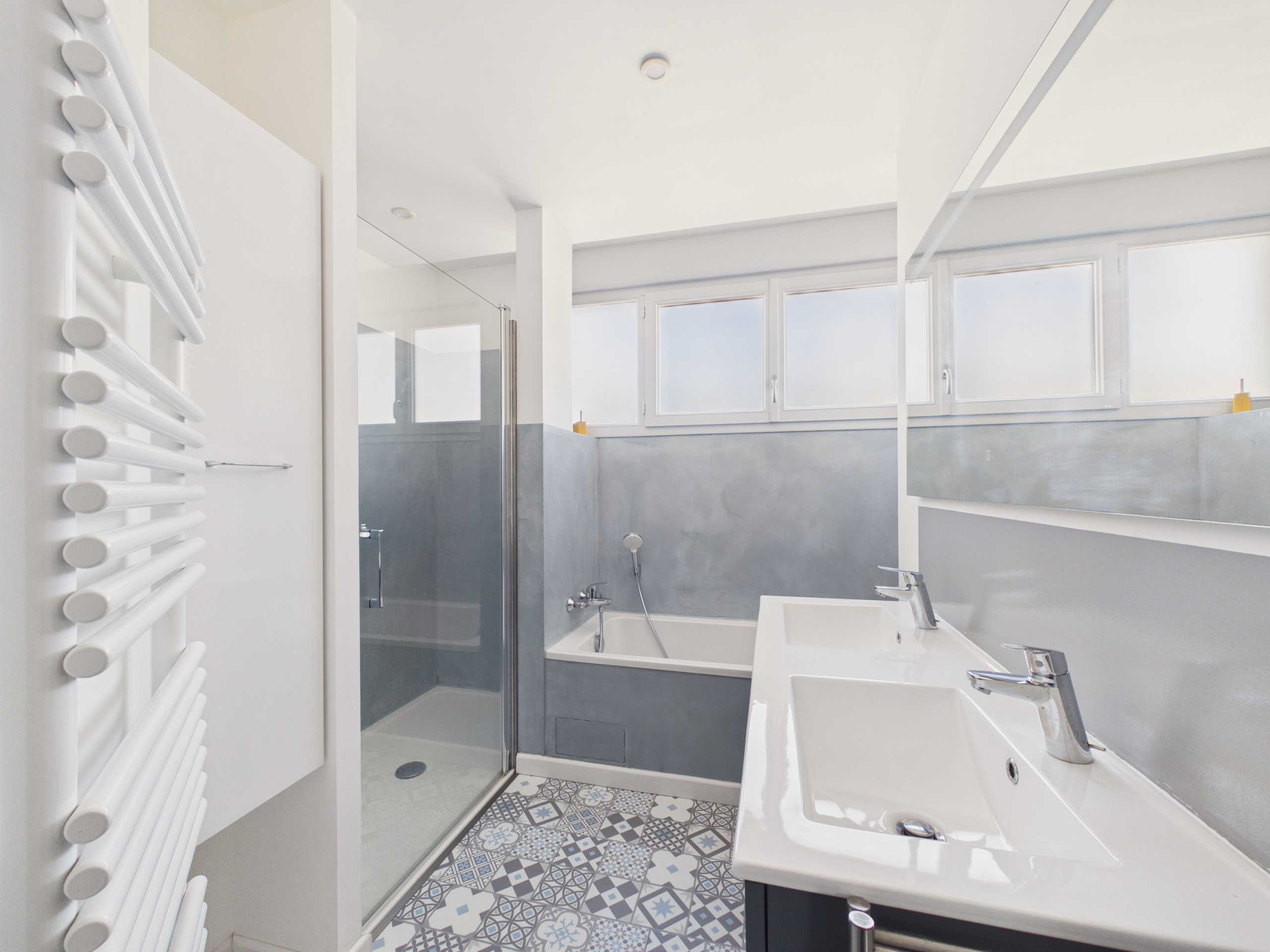 Une salle de bain avec double vasque, baignoire et douche, ainsi qu’un WC indépendant se trouve également à l'étage.