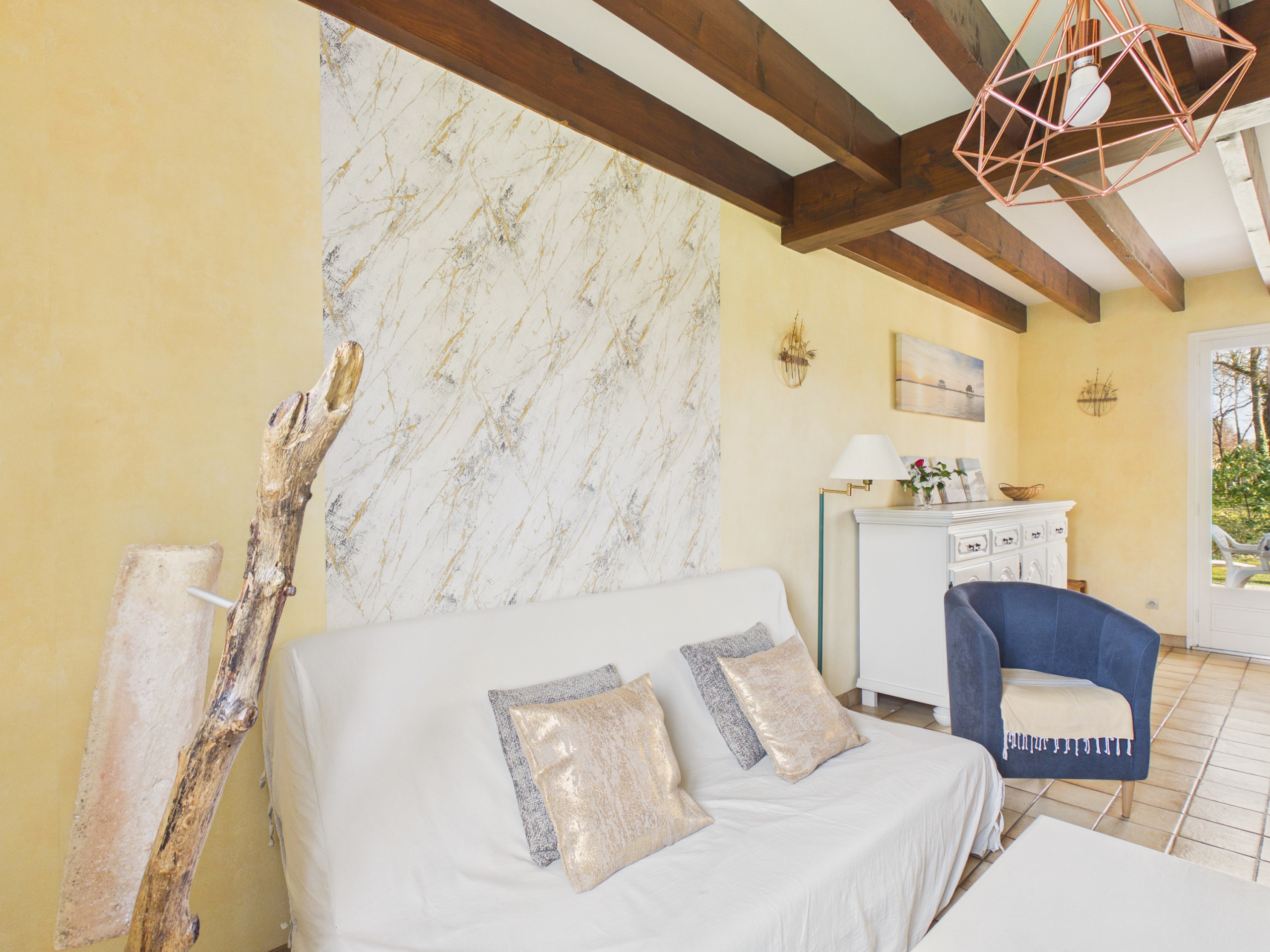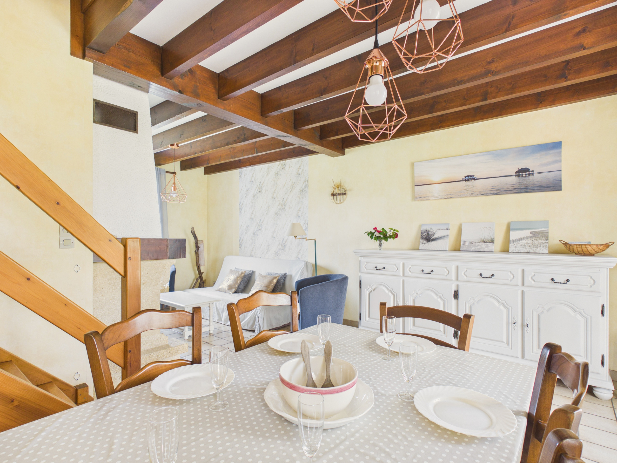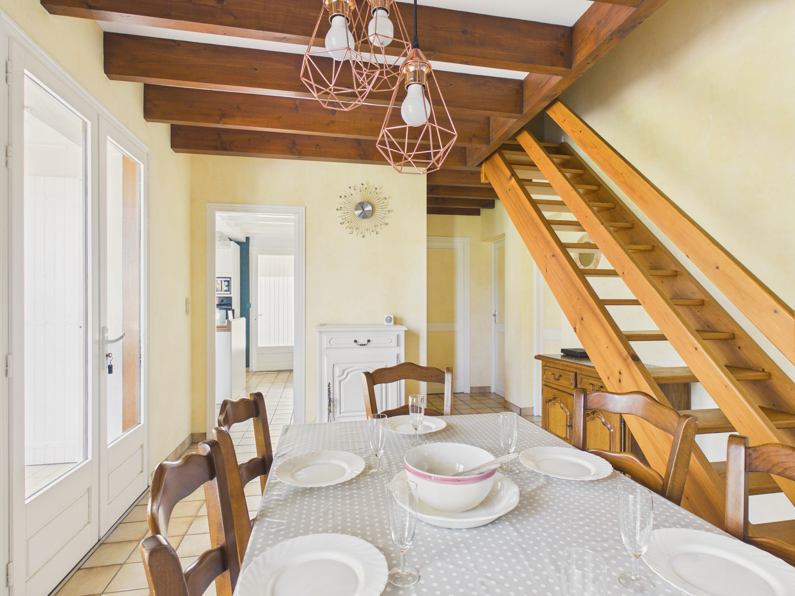 Cette maison peut héberger jusqu'à 8 personnes avec ses 4 chambres. Les deux premières se trouvent au rez-de-chaussée, idéales pour les couples avec un lit double chacune. Les deux autres chambres se trouvent à l'étage, l'une avec trois lits simples parfaite pour les enfants et l'autre est dotée un lit double et un lit simple. Toutes deux sont mansardées, créant une ambiance cosy, idéale pour une bonne nuit de sommeil avec leurs poutres apparentes.