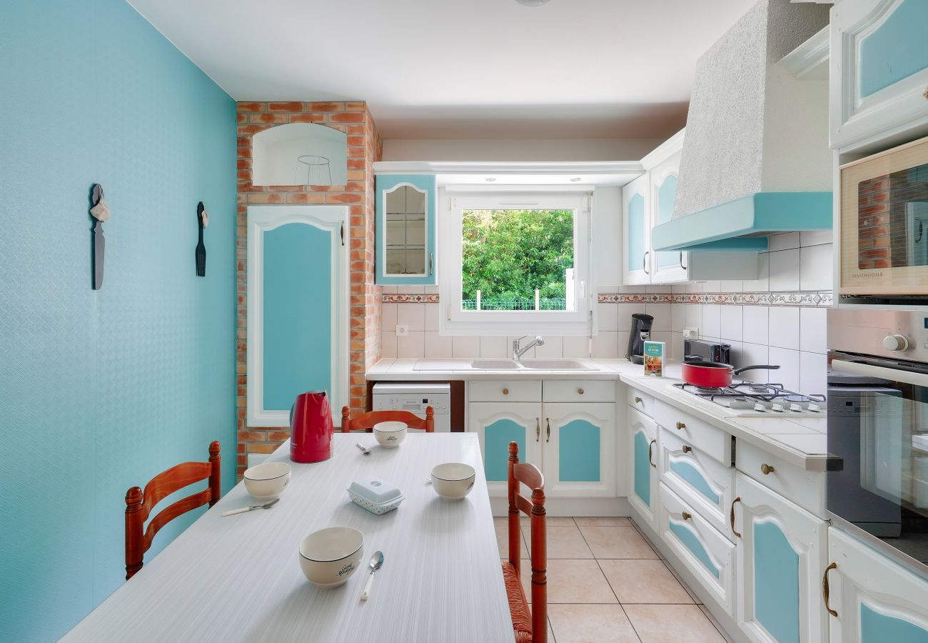 Vous serez accueillis par la pièce de vie : son salon-salle à manger est joliment agencé, les touches bleutées en font un endroit des plus agréables. Le salon vous permettra de faire une pause devant une série ou un film, et la salle à manger vous attend pour vos réunions en famille autour de bons plats, préparés dans la cuisine totalement équipée de la maison. Elle possède une plaque à induction, un réfrigérateur combiné-congélateur, un micro-ondes combiné four, un congélateur, un lave-vaisselle, une cafetière Senseo, une cafetière Expresso, un grille-pain et une bouilloire.