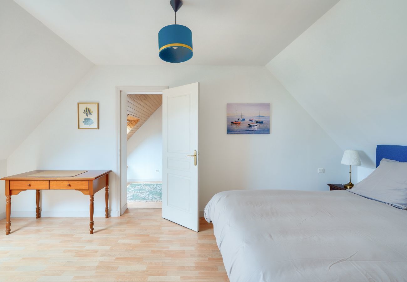Quand la fatigue se fera sentir, vous pourrez monter à l'étage pour vous reposer dans l'une des trois chambres. La première, marron glacée, avec lit double, vous offre un cocon idéal pour une bonne nuit de sommeil. La seconde possède également un lit double ; ses touches bleutées et marines vous plongent dans une ambiance maritime. Puis, en enfilade, une dernière chambre au plafond de bois vous attend avec son lit simple.