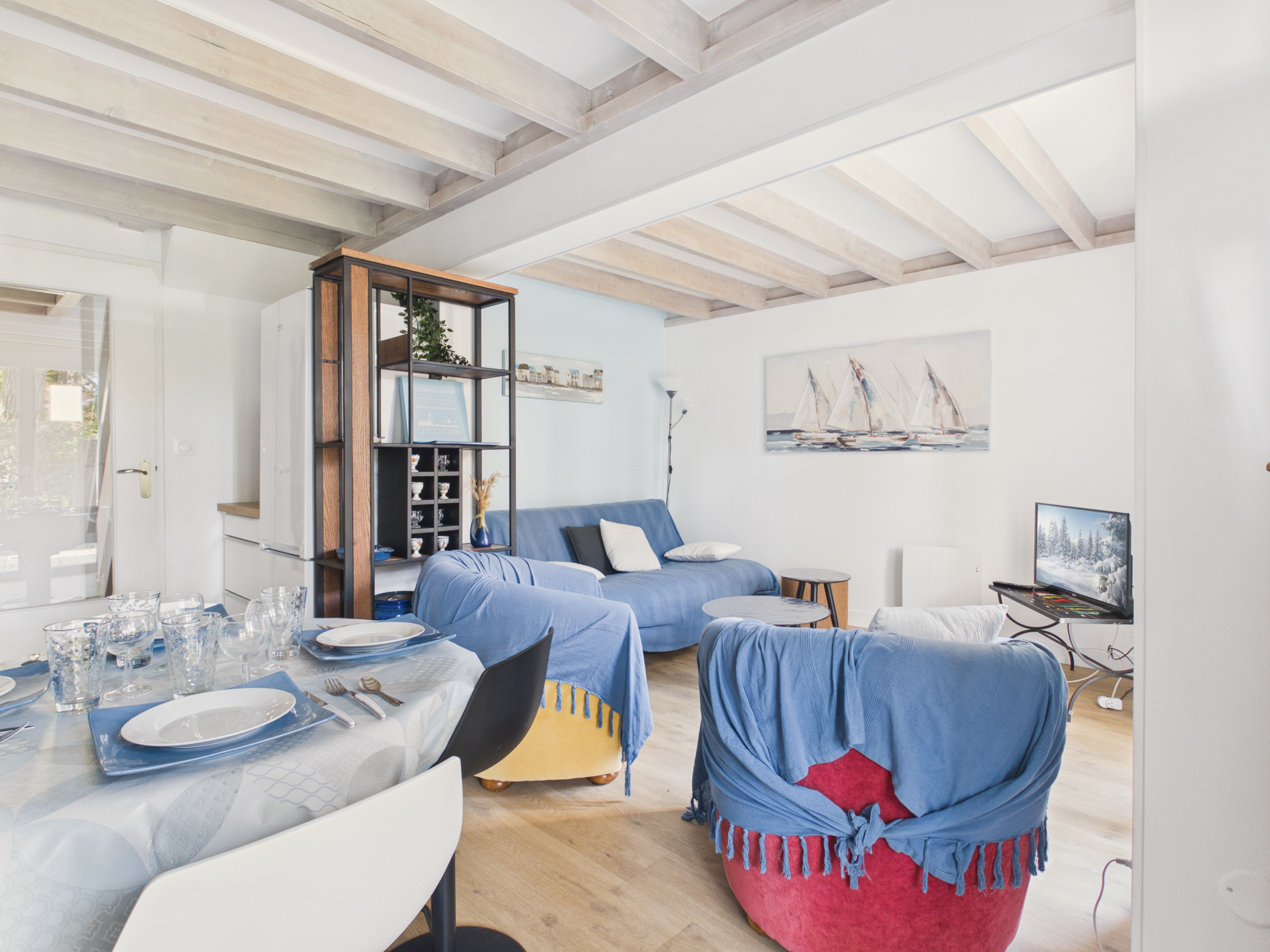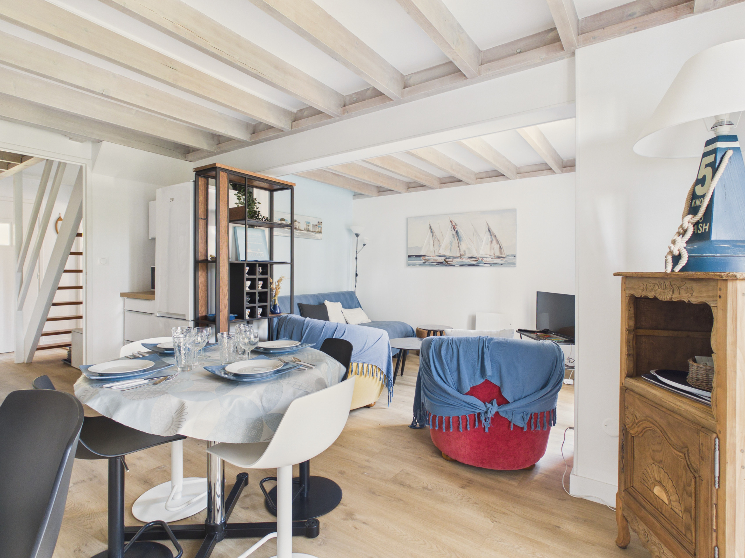Dès votre entrée, vous serez séduits par la pièce de vie lumineuse et chaleureuse donnant sur le jardin. Le salon vous invite à la détente après vos journées à la plage, que ce soit autour d’un apéritif en famille, d’un bon film ou d’un événement sportif à la télévision. Juste à côté, la salle à manger se prolonge dans une cuisine américaine fonctionnelle et bien équipée : plaques de cuisson à gaz, réfrigérateur, micro-ondes, four, lave-vaisselle, cafetières filtre et Senseo, grille-pain, bouilloire et tout le nécessaire pour concocter de bons repas.