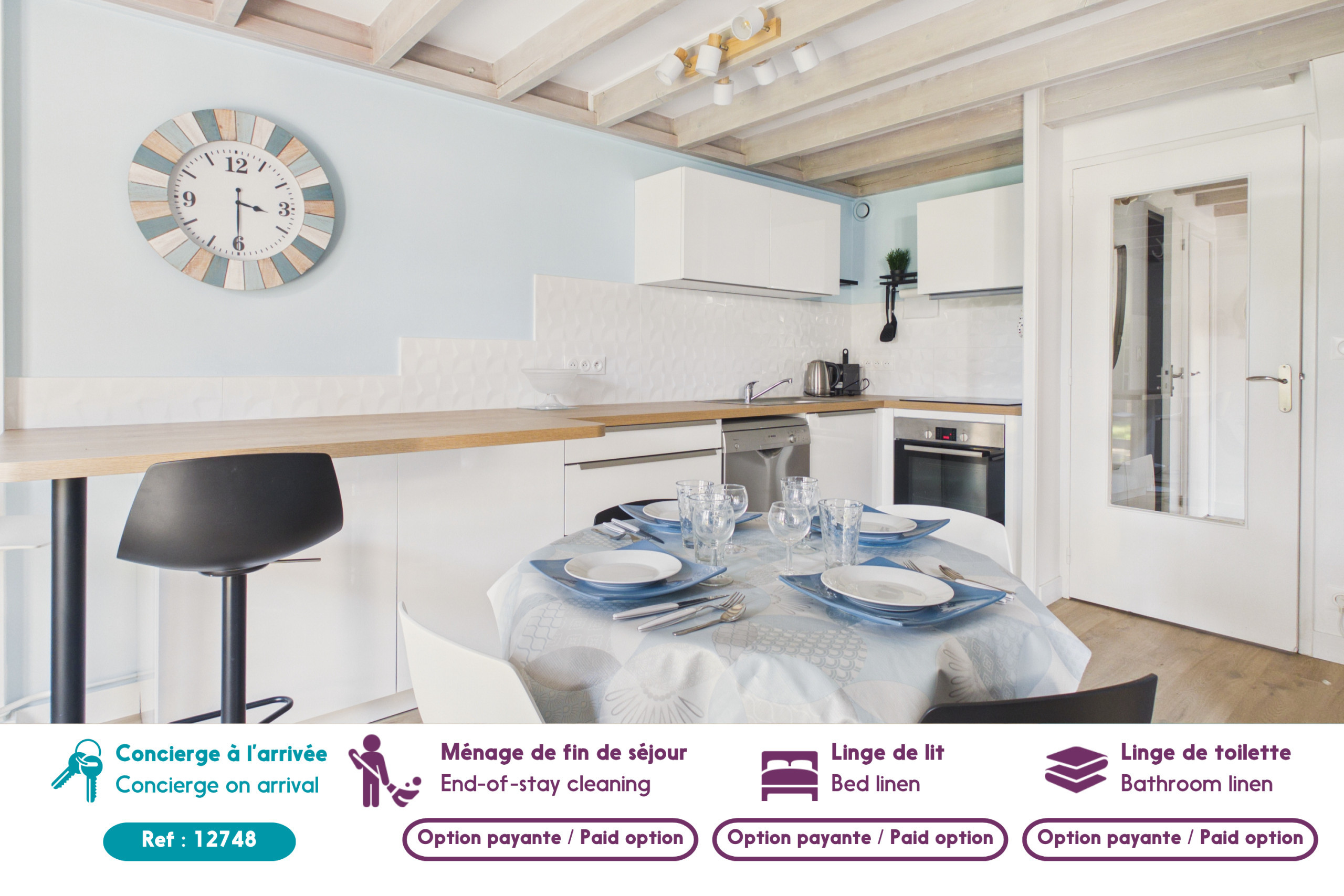 Le linge de maison et le ménage de fin de séjour sont proposés en option, selon le niveau de confort souhaité. Le linge commandé est fourni à votre arrivée pour toute la durée du séjour, sans renouvellement possible. Le ménage en cours de séjour n’est pas inclus dans nos prestations.