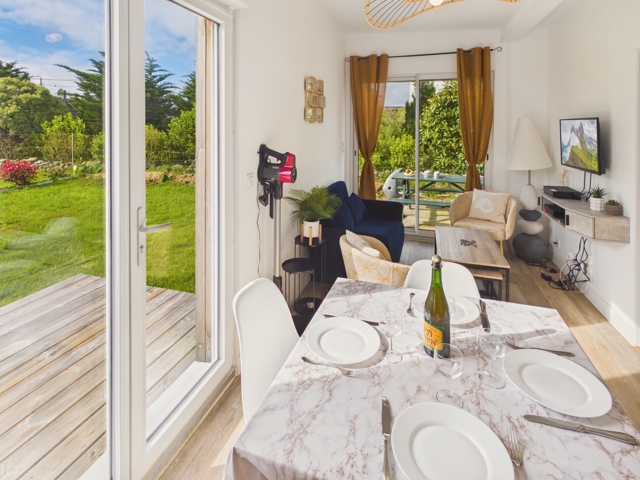 Dès votre arrivée, vous découvrirez une lumineuse pièce de vie composée d’un coin salon, d’une salle à manger et d’une cuisine ouverte. Le salon, avec son canapé et son fauteuil, est équipé d’une télévision, idéale pour des moments de détente. Vous pourrez partager vos repas autour de la table intérieure ou profiter de celle installée sur la terrasse.