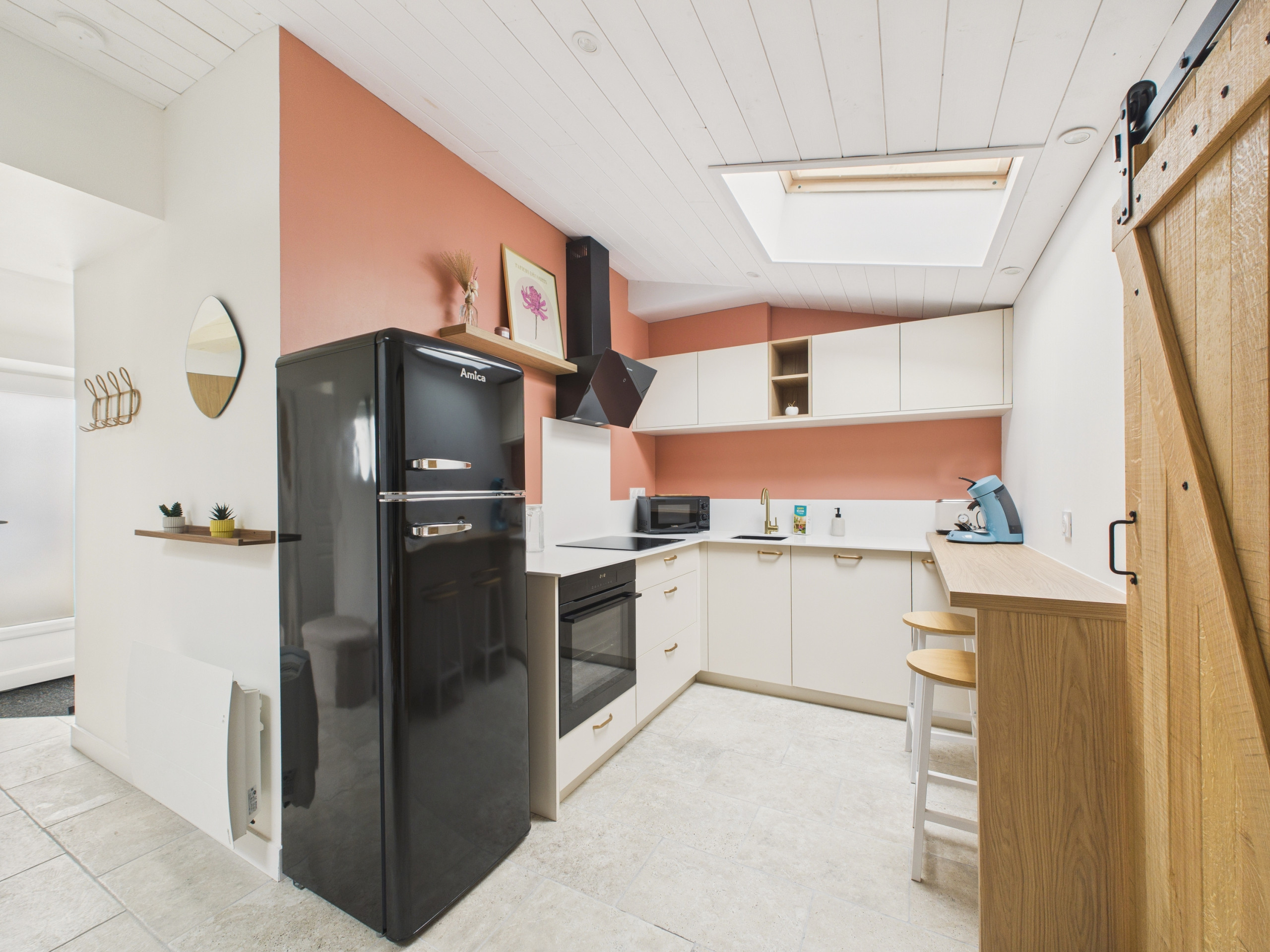 Au rez-de-chaussée, le salon est ouvert sur la cuisine aménagée et équipée de plaques induction, d’un micro-ondes, d’un four, d’un réfrigérateur-congélateur, d’un lave-vaisselle, d’une cafetière à filtre, d’une bouilloire, d’un grille-pain et de tout le nécessaire de cuisine afin que vous vous sentiez comme chez vous. Une salle d’eau et deux WC complète la location.