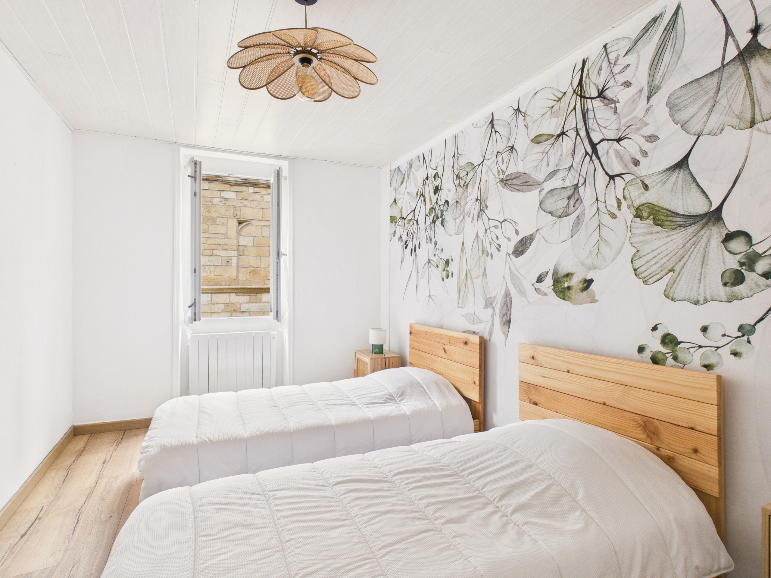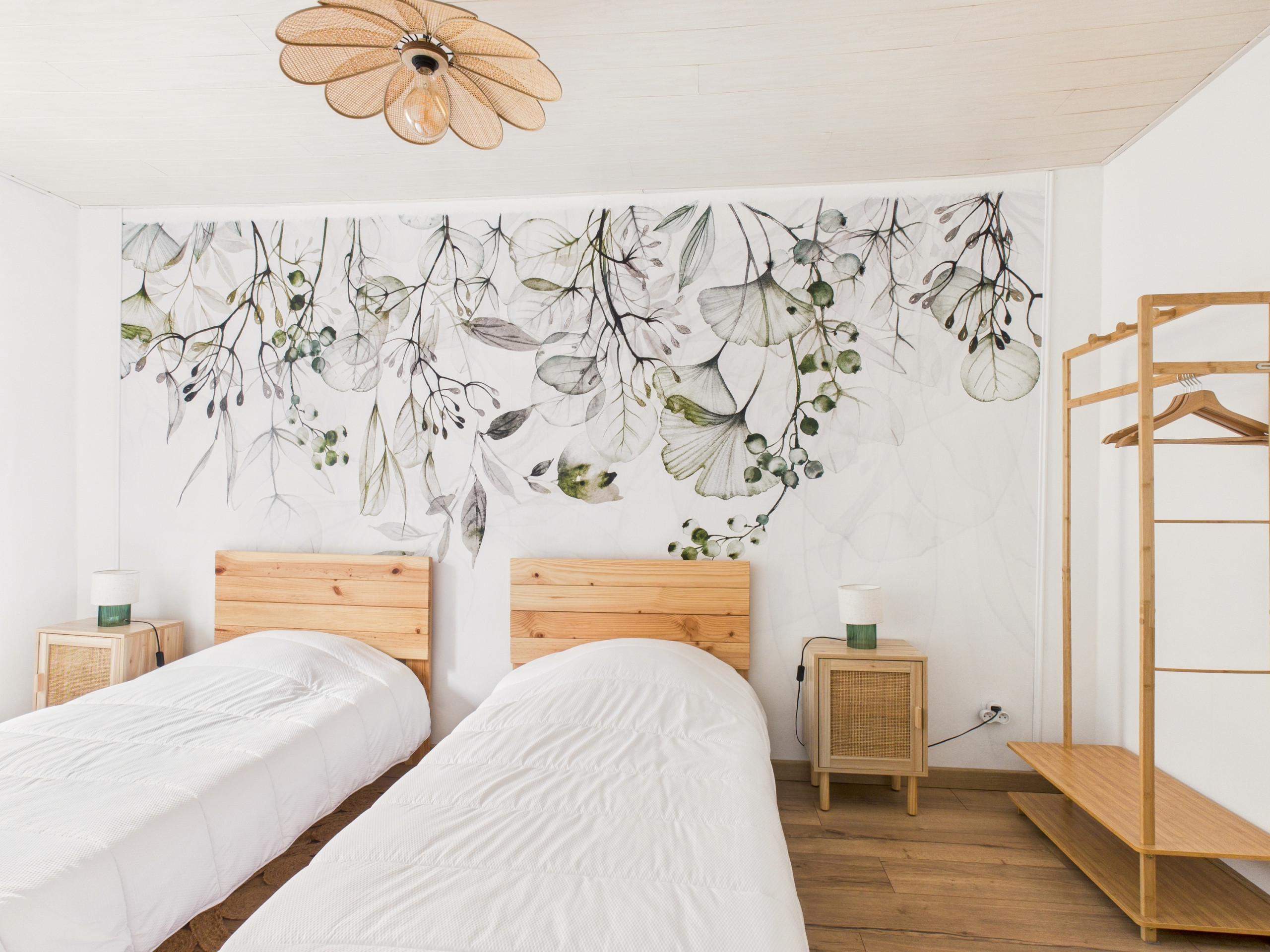 Le logement compte deux chambres à l’étage. La première dispose de deux lits simples (90x200 cm), tandis que la seconde est équipée d’un lit Queen Size (160x200 cm) et offre un accès privatif à une terrasse de 10 m².
