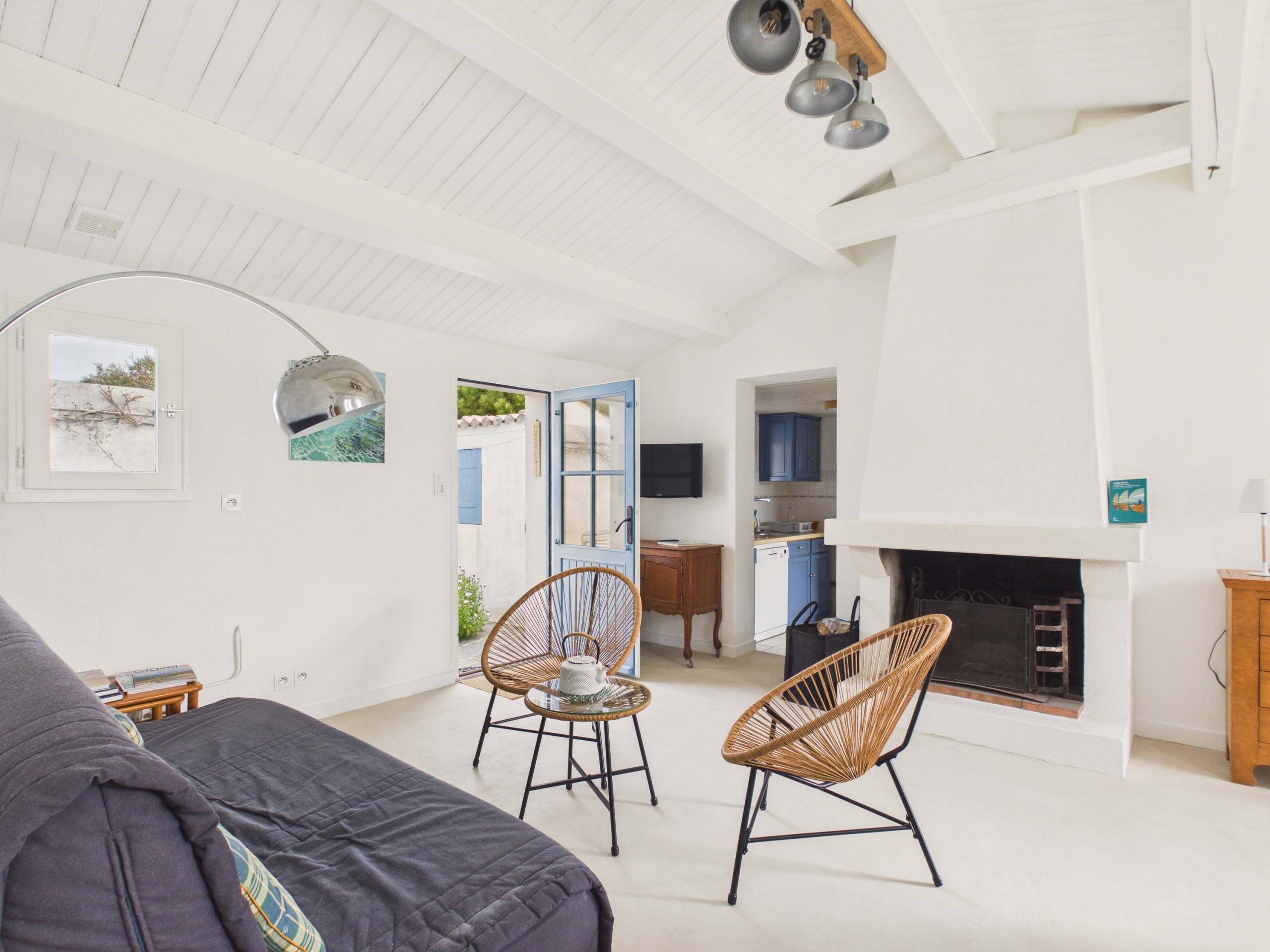 À l’intérieur, vous arriverez directement dans une pièce de vie conviviale et lumineuse. Le salon, composé d’un canapé, de deux fauteuils, d’une télévision et d’une cheminée décorative qui apporte du charme à l’ensemble. Deux portes vitrées permettent d’accéder aux terrasses se situant de chaque côté de la maison et apportent une belle luminosité. Dans le prolongement, la salle à manger offre une table pouvant accueillir jusqu’à 6 convives. La cuisine indépendante, fonctionnelle et bien équipée, comprend des plaques vitrocéramiques, un réfrigérateur, un congélateur, un four, un micro-ondes, un lave-vaisselle, une cafetière filtre, un grille-pain, une bouilloire ainsi que tout le nécessaire pour cuisiner.
