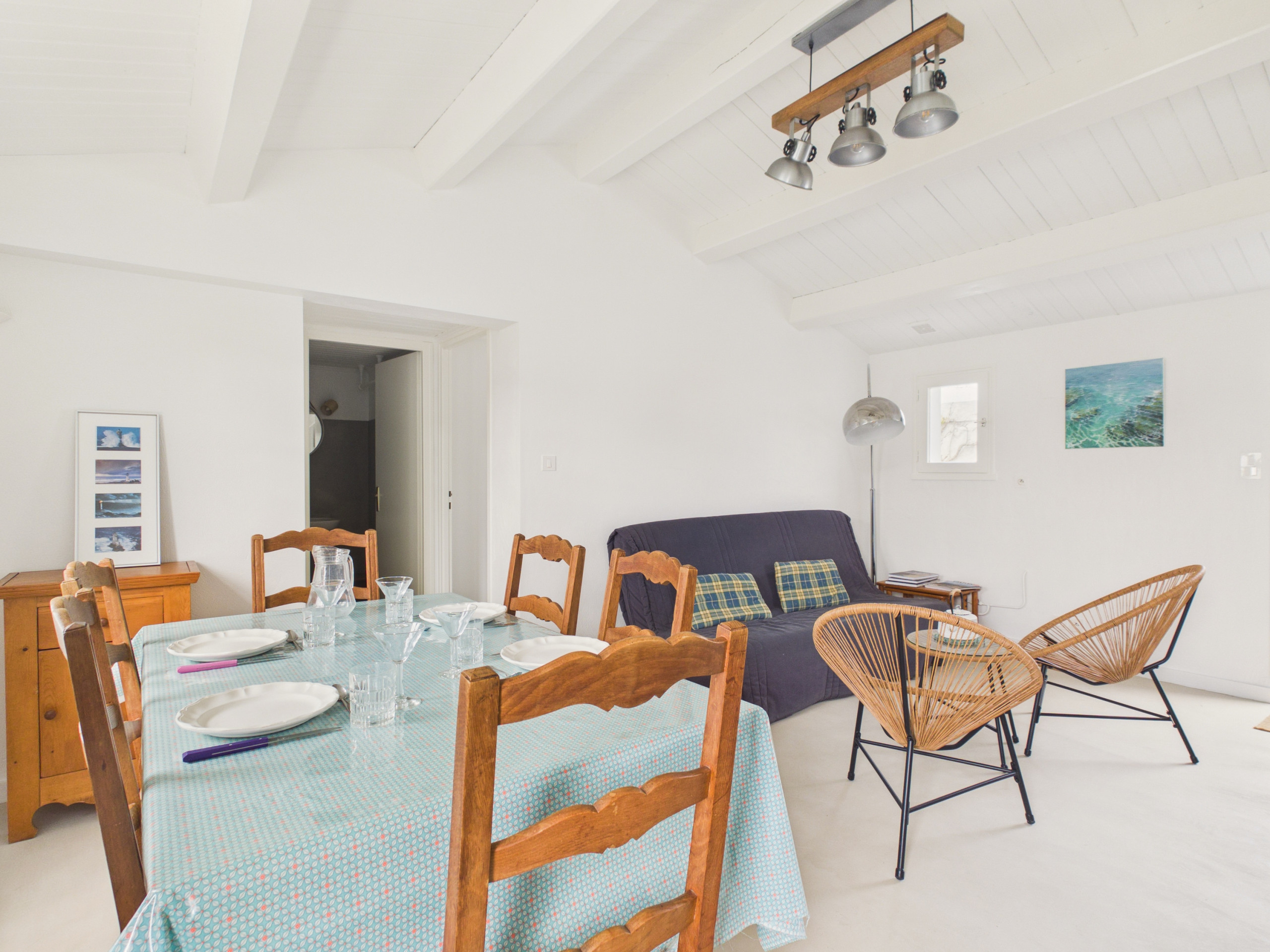 La pièce de vie au sol en damier vous accueille pour des moments en famille ou entre amis. Ici, vous pourrez partager des moments de convivialité autour de bons repas ou confortablement installés sur le canapé à bavarder (la télévision n'est plus disponible). La cuisine met à votre disposition tout le nécessaire pour mijoter de bons plats : plaque à induction, réfrigérateur, micro-ondes, four, congélateur, cafetière à filtre, grille-pain et bouilloire.
