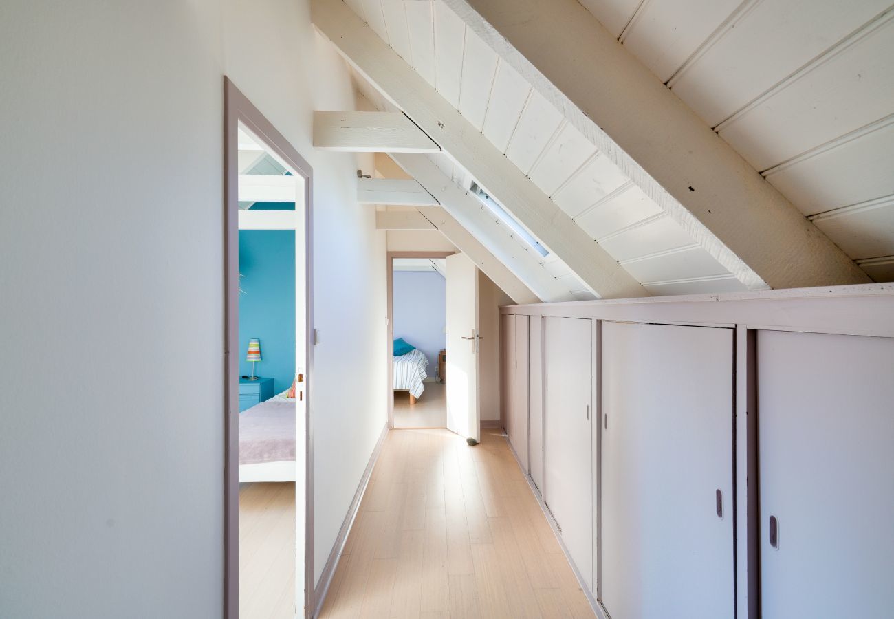 Le logement peut accueillir jusqu'à 5 personnes et dispose donc de 3 chambres. La première se trouve au rez-de-chaussée, ses tons bleutés rappellent le bord de mer et offrent un cadre idéal pour votre repos. De plus, elle dispose d'un lit king-size pour votre confort. Ensuite, vous trouverez une seconde chambre avec un lit king-size à l'étage. Sa double pente de toit et son ton lavande en font un cocon de sérénité. Enfin, vous découvrirez une chambre avec deux lits simples, parfaite pour les enfants.