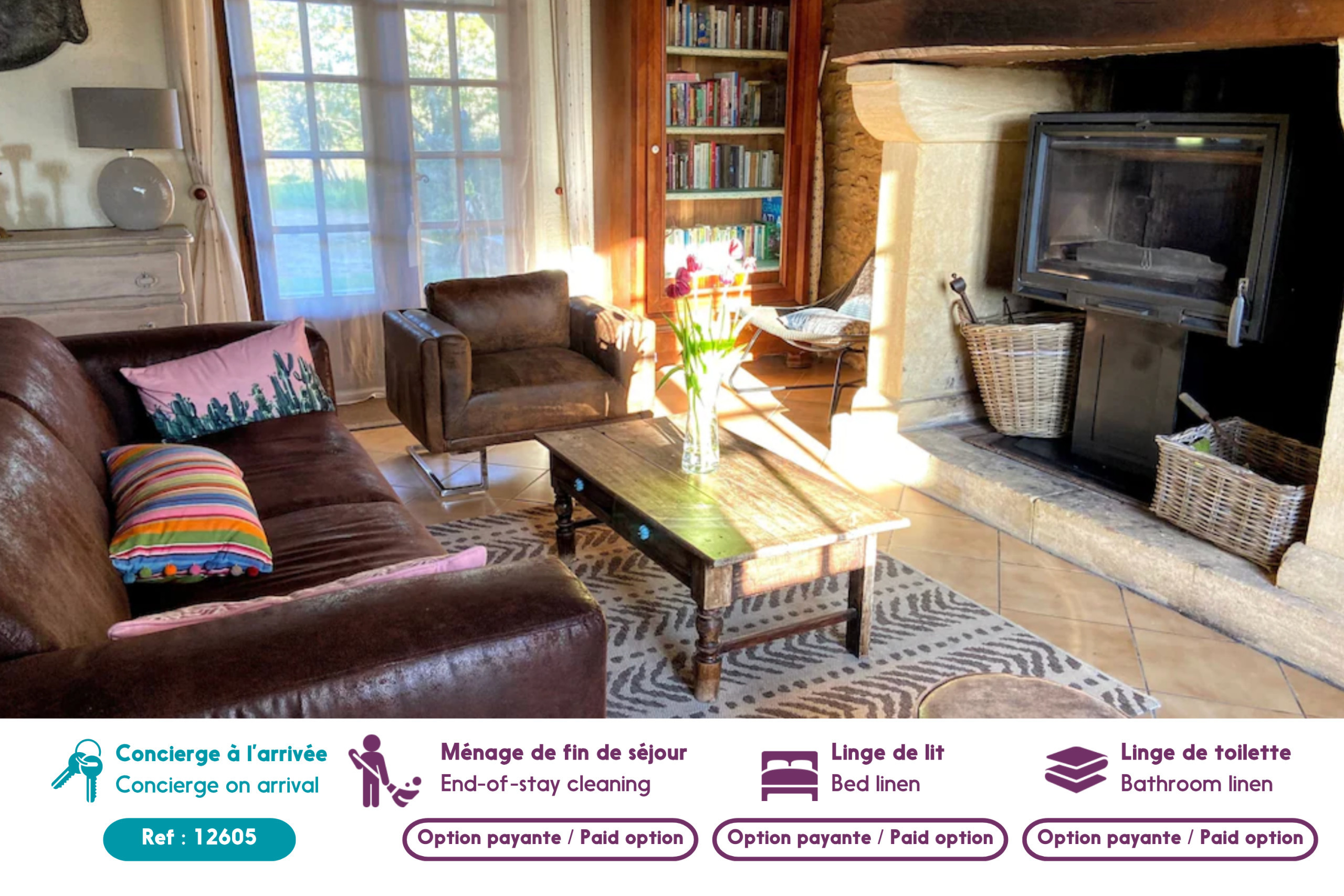 Les pièces de la maison conservent leurs anciennes pierres et leurs poutres apparentes au plafond, qui rajoutent un charme indéniable, avec un grand poêle à bois réchauffant l'atmosphère en hiver pour des moments conviviaux auprès du feu.