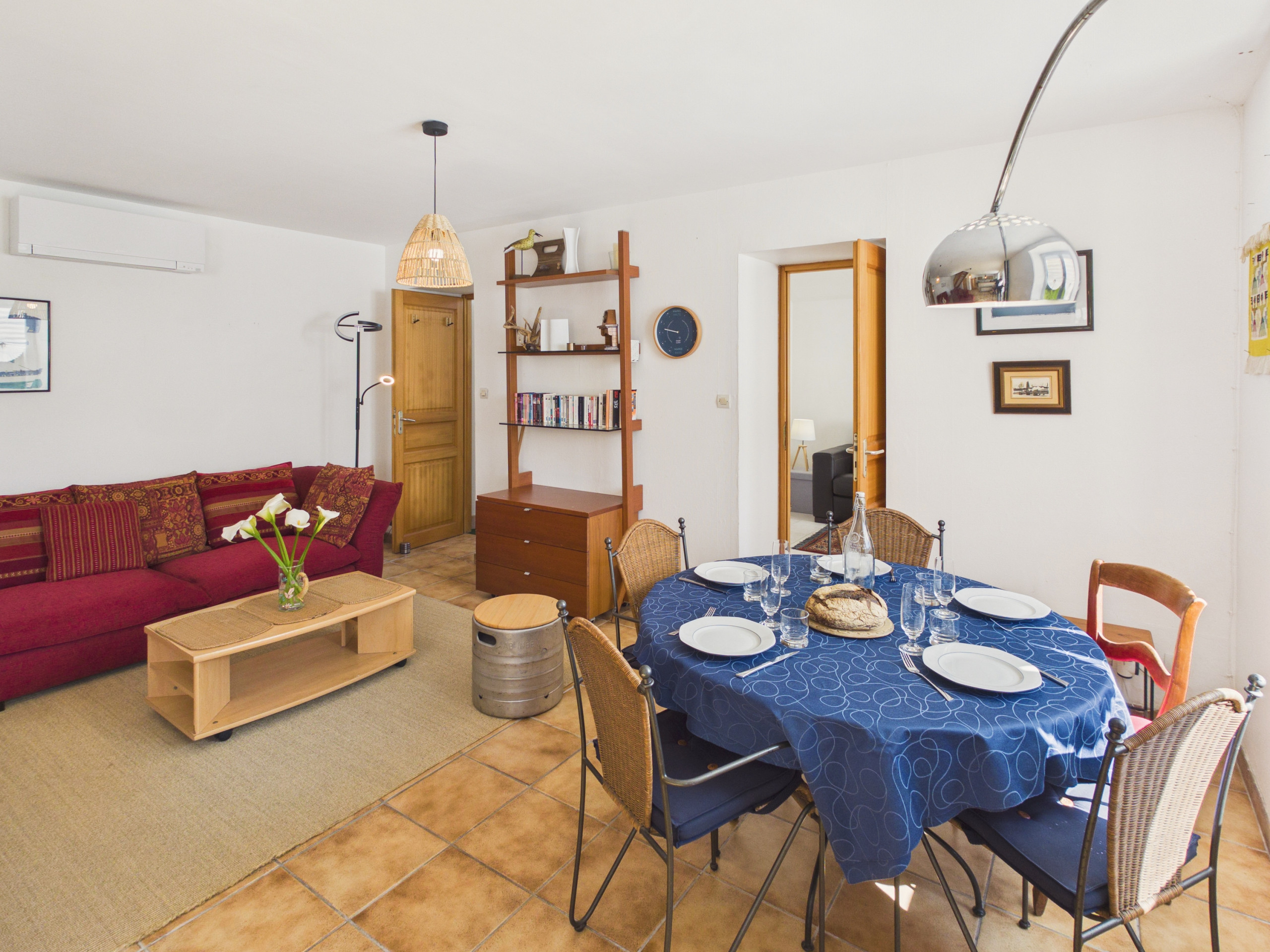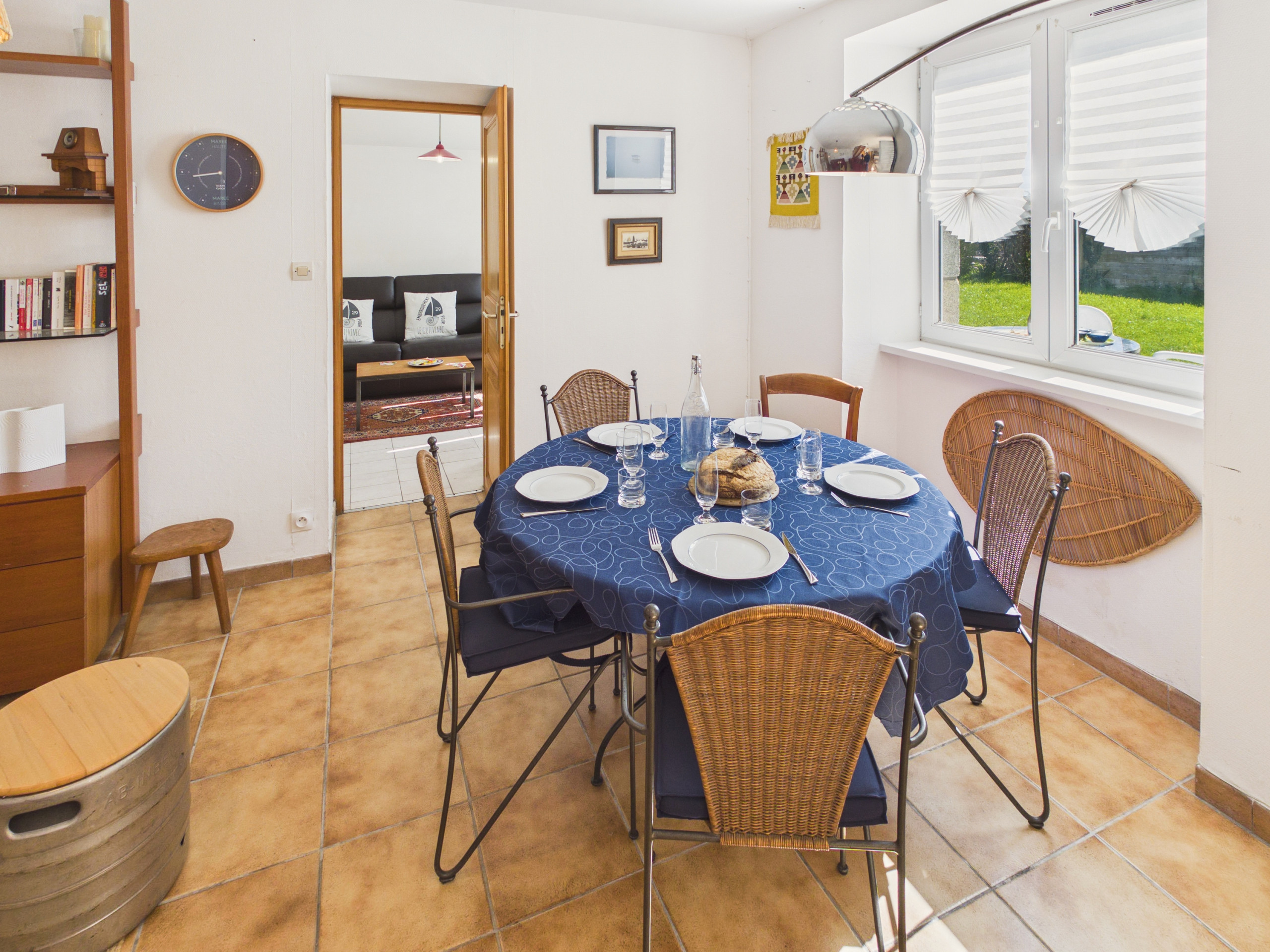 Passez la porte d’entrée et découvrez une agréable pièce de vie donnant accès à la terrasse par une baie vitrée. La cuisine moderne et ouverte est entièrement équipée (réfrigérateur, congélateur, four, micro-ondes, lave-vaisselle, plaques à induction) pour cuisiner comme à la maison. Pour vos petits-déjeuners, une bouilloire, un grille-pain et une cafetière à filtre sont à votre disposition. Partagez vos repas autour de la table à manger pour 5 personnes ou profitez celle de la terrasse aux beaux jours. Le soir, retrouvez-vous dans le salon, confortablement installés dans le canapé face à la télévision.
