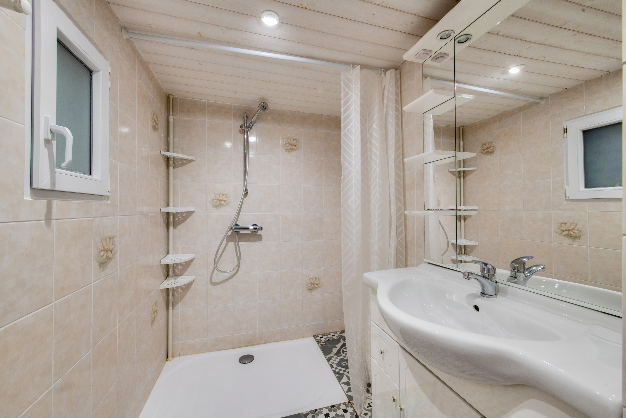 À l’étage se trouve également une grande salle de bain avec baignoire, lave-linge et sèche-cheveux. Deux WC indépendants complètent le logement.