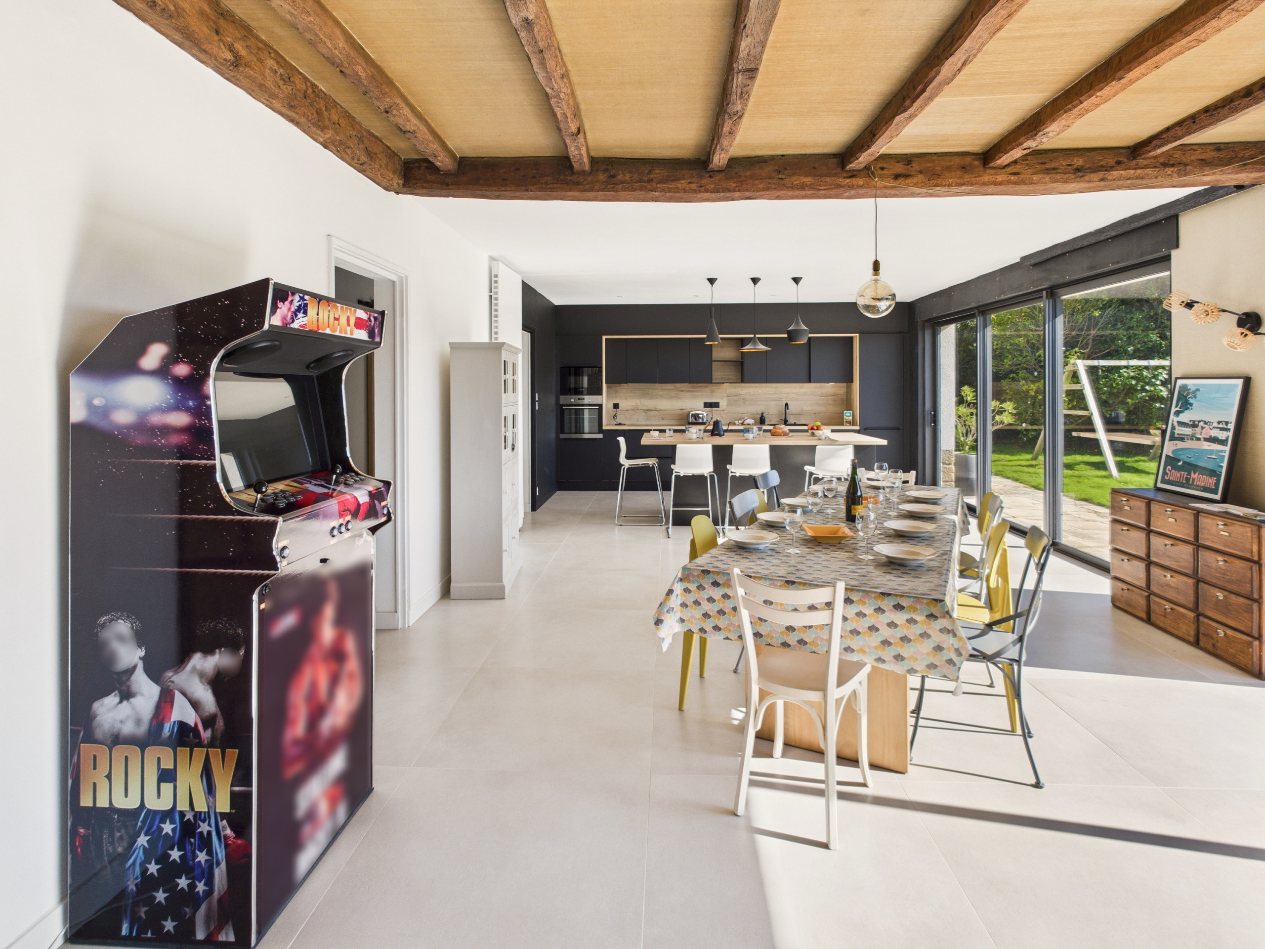 Passez la porte d’entrée et découvrez une grande pièce de vie lumineuse d’environ 65 m², ouverte sur la terrasse et le jardin. La cuisine, ouverte et moderne, est entièrement équipée (réfrigérateur, congélateur, four, micro-ondes, lave-vaisselle) et vous offre tout le nécessaire pour cuisiner comme à la maison. Pour vos petits-déjeuners, une bouilloire, un grille-pain et une cafetière à capsules Magimix sont à votre disposition. Partagez vos repas autour de la table à manger pour 10 personnes, ou profitez de celle de la terrasse aux beaux jours. Le soir, retrouvez-vous dans le coin salon, confortablement installés sur les canapés, devant la télévision. Une arrière-cuisine est également à votre disposition, avec un évier, de nombreux placards de rangement, un lave-linge et un sèche-linge.