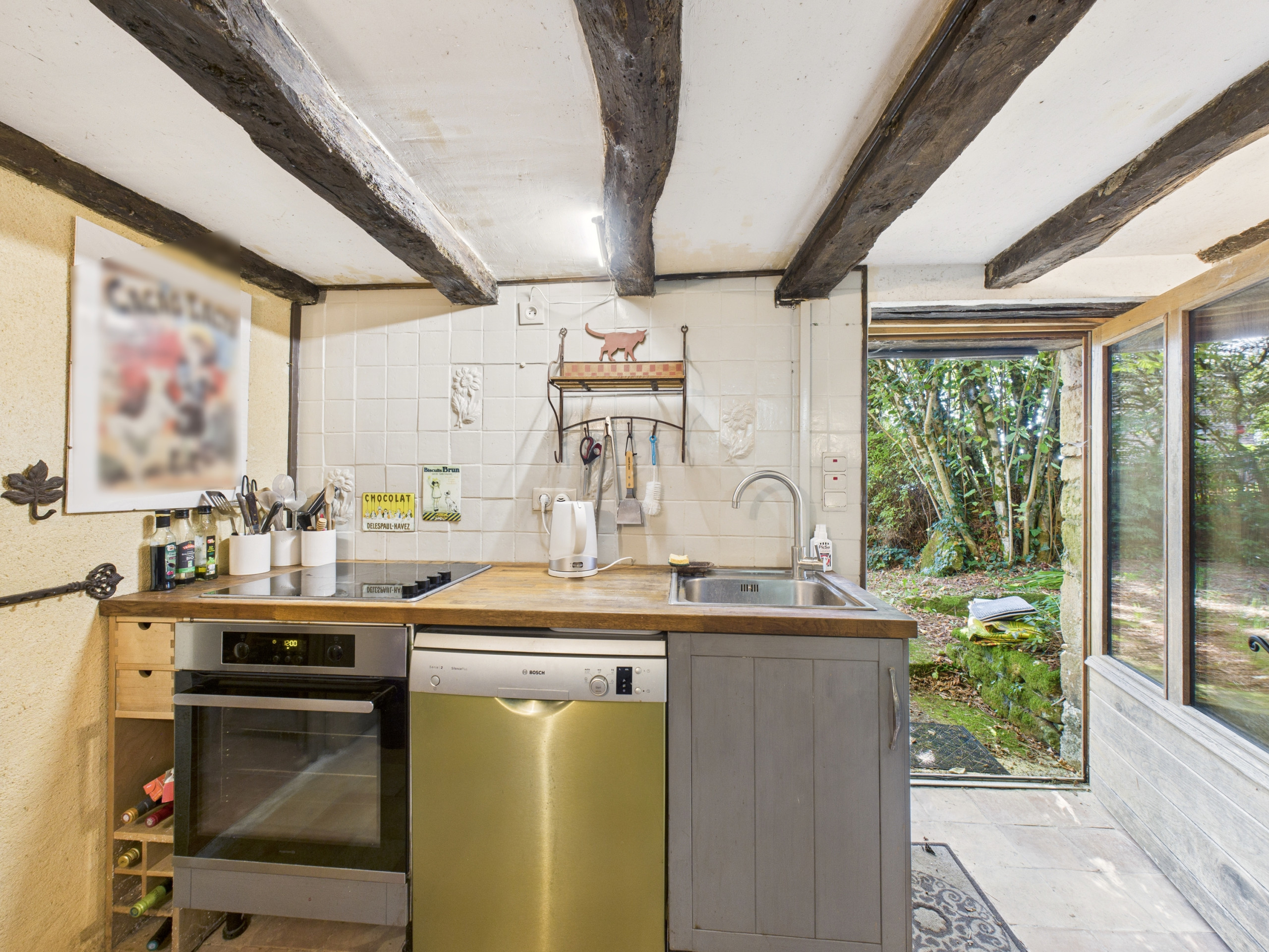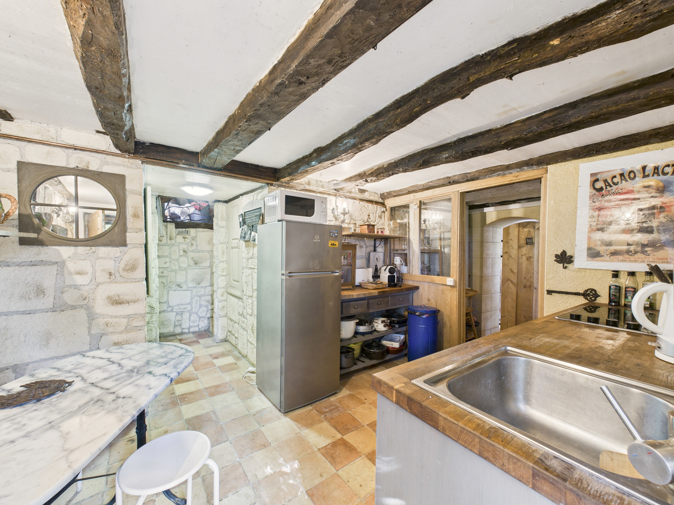 La cuisine est située au sous-sol et bas de plafond (1,80m). Elle est entièrement équipée (réfrigérateur, congélateur, plaques vitrocéramiques, four, micro-ondes, lave-vaisselle) et vous permettra de cuisiner comme à la maison. Pour vos petits-déjeuners, une bouilloire, un grille-pain et une cafetière Nespresso sont également à votre disposition.