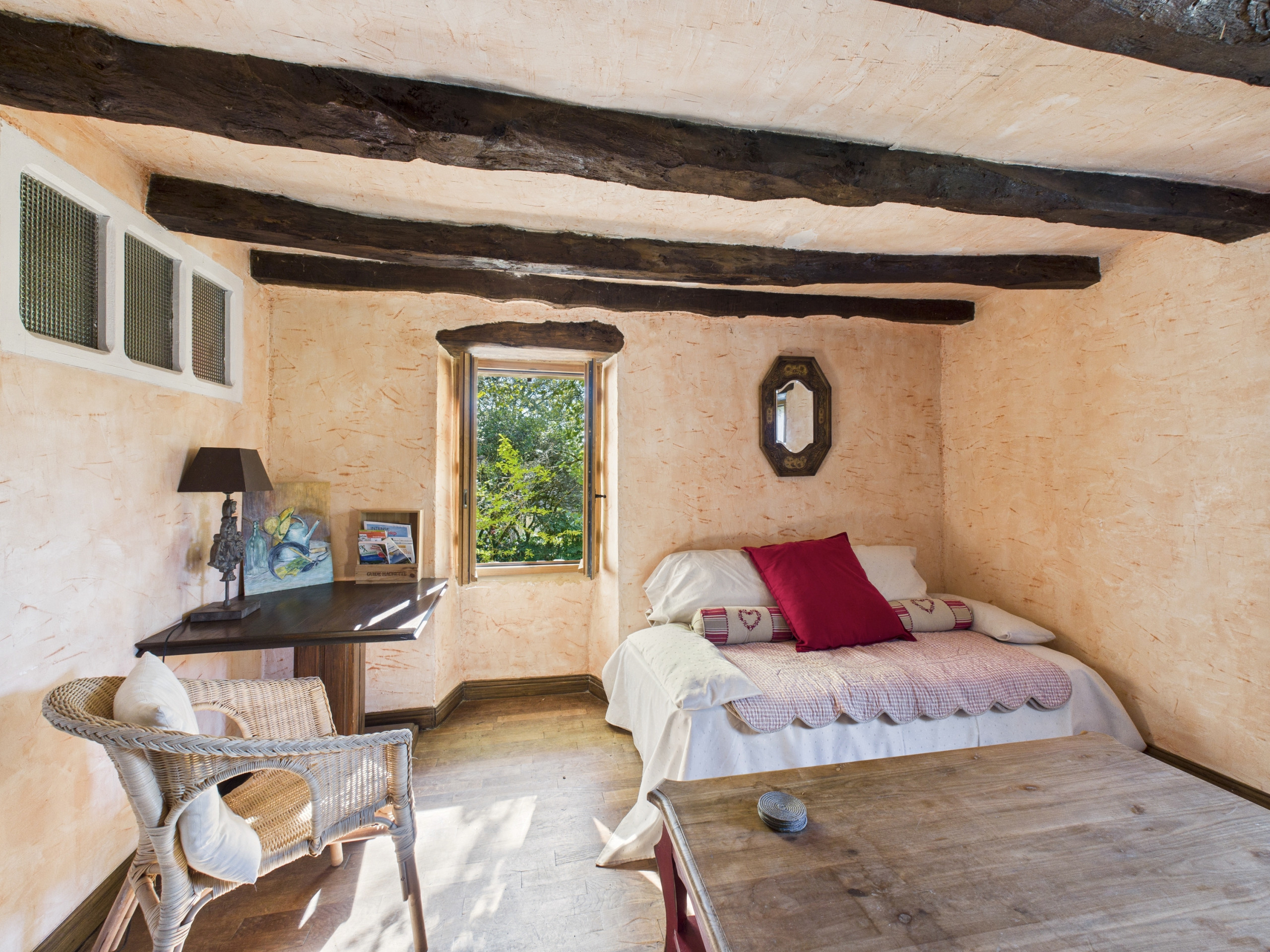 Pouvant accueillir jusqu'à 6 personnes, la maison dispose d’une chambre dans la bâtisse principale et de trois autres dans la tour. Deux de ces chambres sont communicantes et reliées par un escalier.