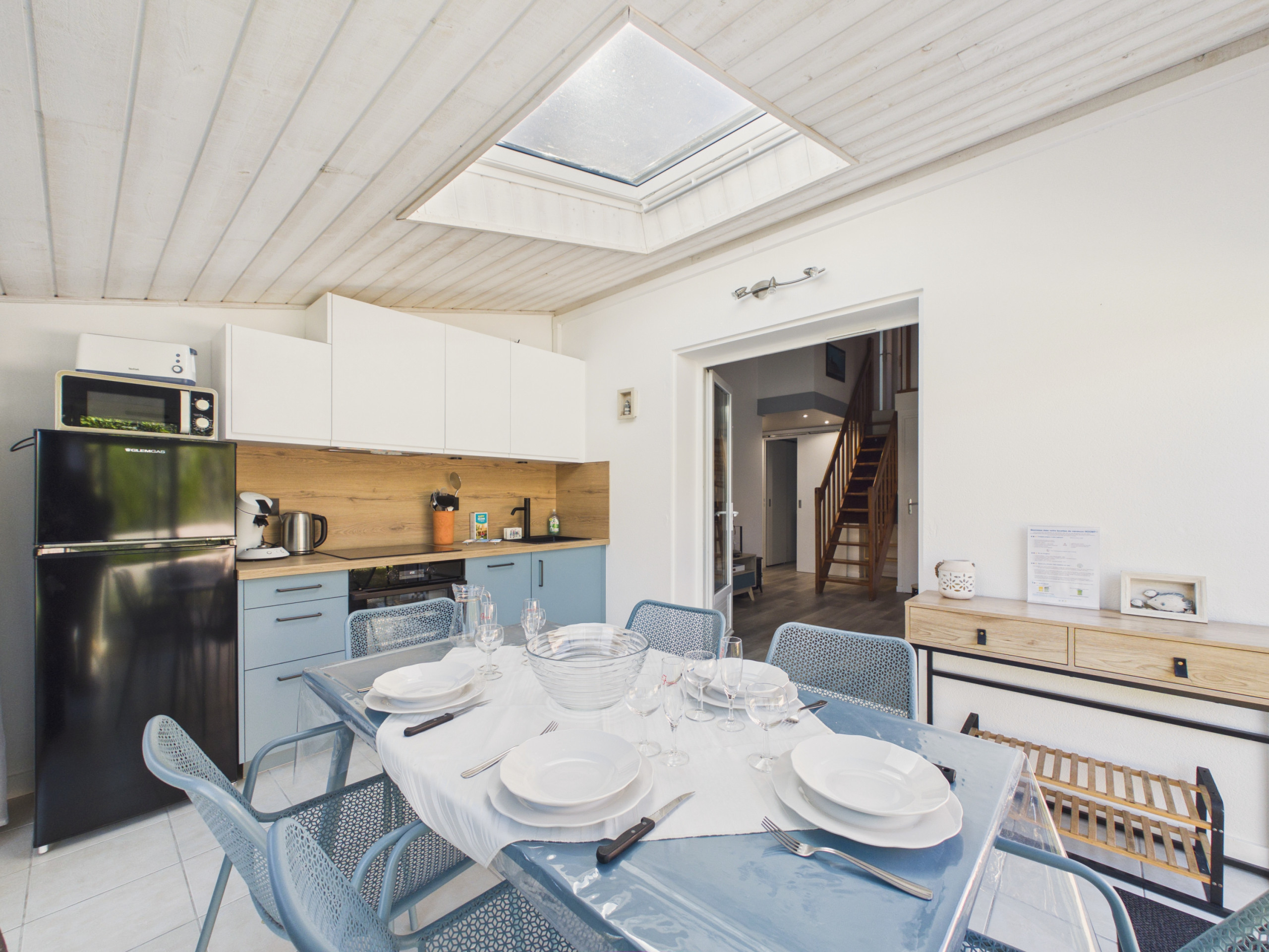 La location se compose d’une cuisine équipée avec tout le nécessaire pour que vous vous sentiez comme chez vous : plaque vitrocéramique, four, lave-vaisselle, réfrigérateur-congélateur, micro-ondes, cafetière à filtre et Dolce Gusto, grille-pain, bouilloire ainsi qu'un appareil à raclette. Le salon / salle à manger dispose d’une télévision et d’une cheminée avec bois à disposition.
