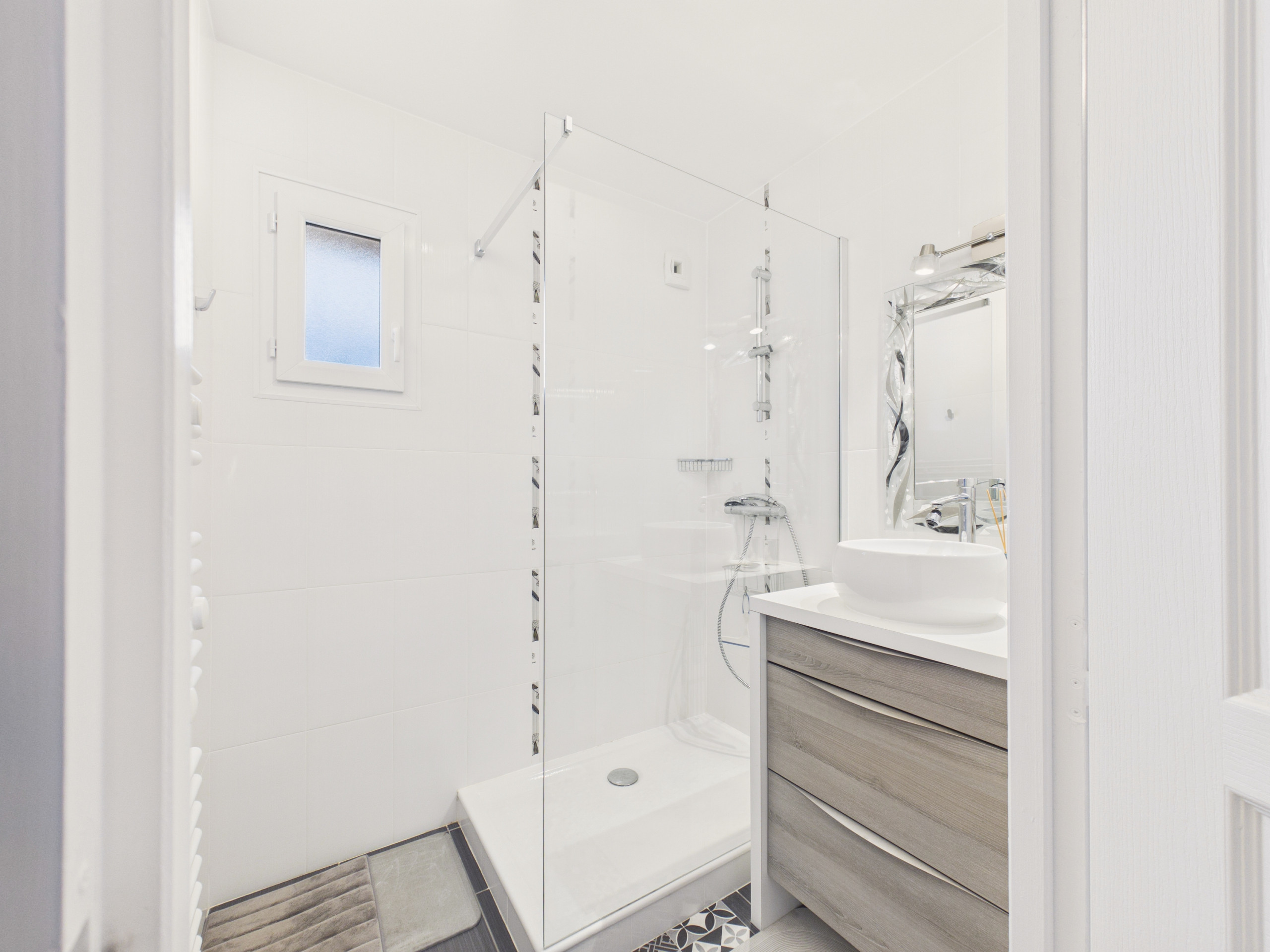 Le logement dispose également d’une salle d’eau au rez-de-chaussée avec douche et sèche-cheveux, d’une salle de bain avec baignoire et WC à l’étage, et d’un WC indépendant supplémentaire.