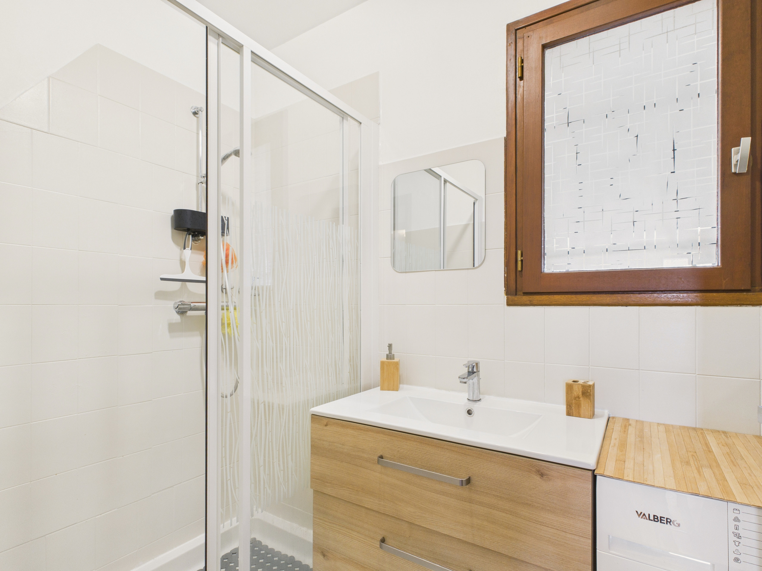 La visite se poursuit par les chambres : deux sont équipées d’un lit double (140x190 cm) et la troisième de deux lits simples (90x190 cm). Une salle d’eau avec sèche-cheveux est également à disposition. Pour votre confort, la maison dispose aussi d’une machine à laver, d’un fer et d’une table à repasser.