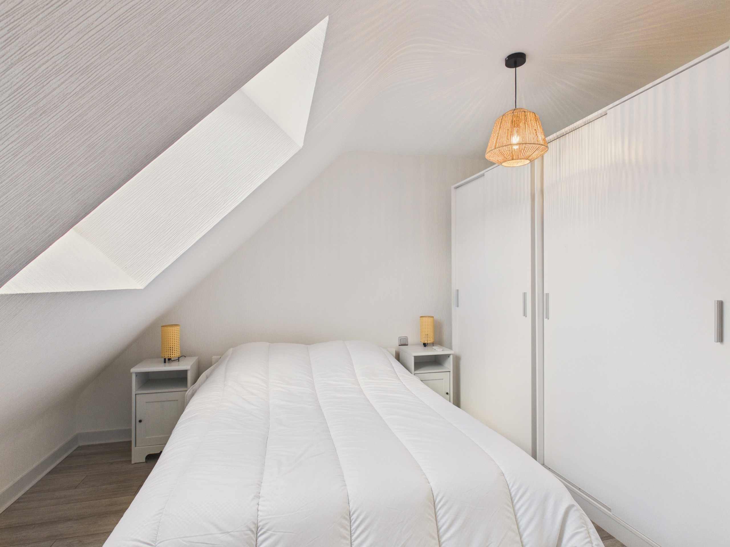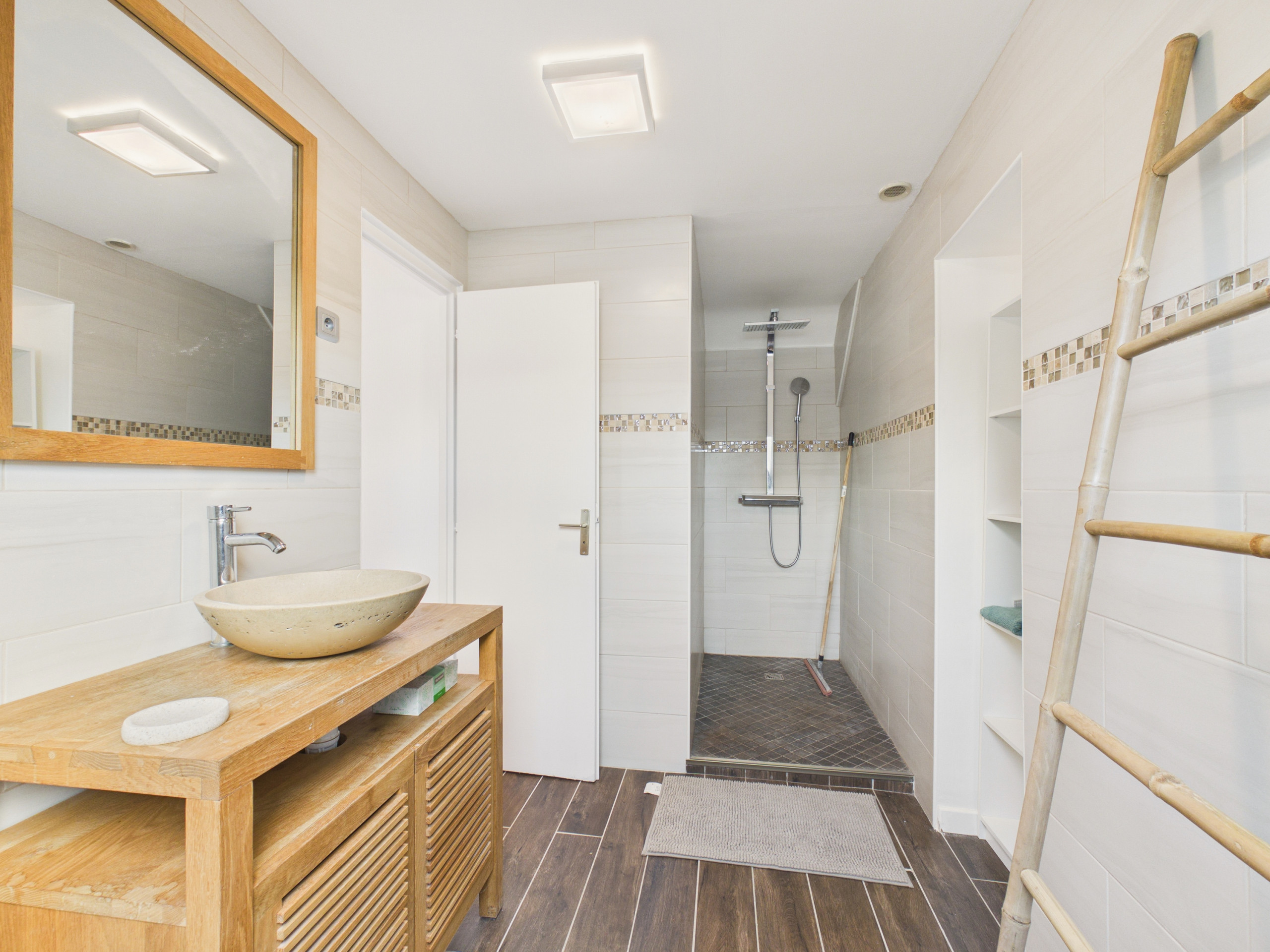 La salle de bain, située à l’étage, dispose d’une douche, d’un WC et d’un sèche-cheveux. Un second WC indépendant complète le logement.