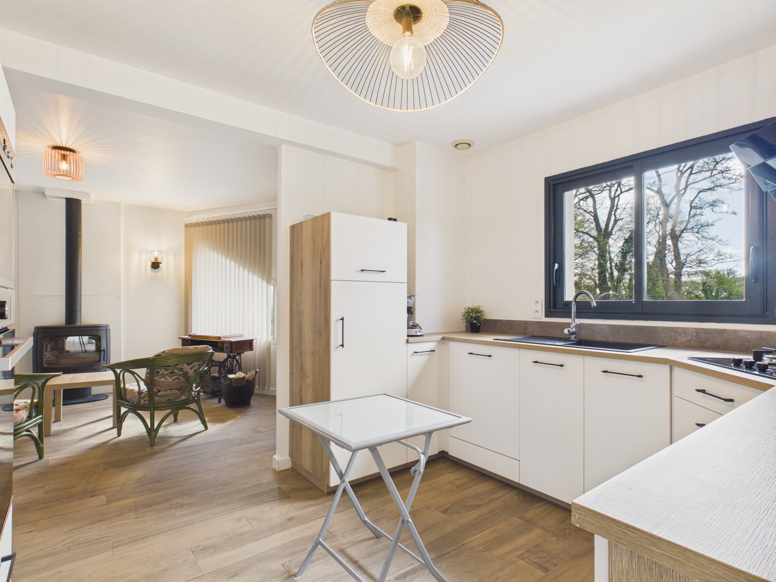 Passez la porte d’entrée et découvrez une agréable pièce de vie donnant accès à la terrasse. La cuisine, ouverte et moderne (réfrigérateur, congélateur, plaques à gaz, four, micro-ondes, lave-vaisselle), vous permettra de préparer vos repas comme à la maison. Pour le petit-déjeuner, vous disposerez également d’une bouilloire, d’un grille-pain ainsi que de deux cafetières (une à filtre et une Expresso). Vous pourrez partager vos repas autour de la table à manger intérieure ou profiter de la table de la terrasse aux beaux jours. Le soir, retrouvez-vous dans le coin salon, confortablement installés sur le canapé face à la télévision.