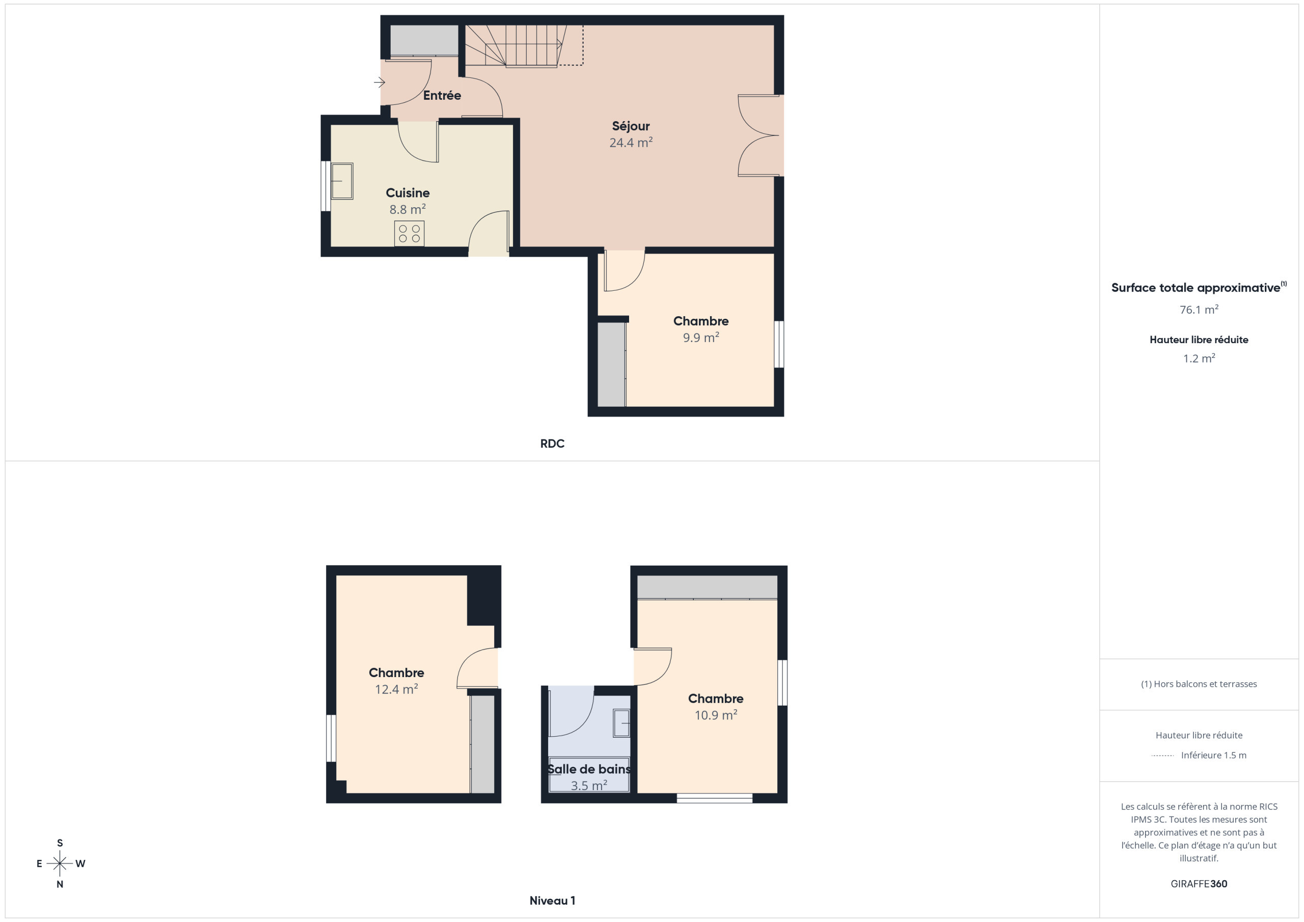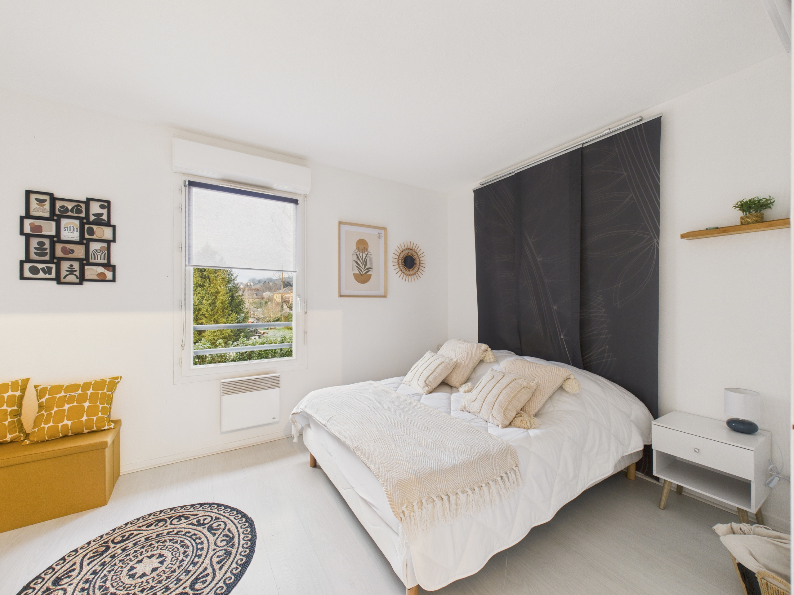 À l’étage, deux chambres vous attendent : à droite, une chambre avec lit double (140x190 cm) et salle de bain privative (douche et WC) ; à gauche, une chambre avec un lit double (160x190 cm), un canapé convertible (idéal pour un enfant) et un accès direct à la terrasse plein sud pour profiter du soleil.