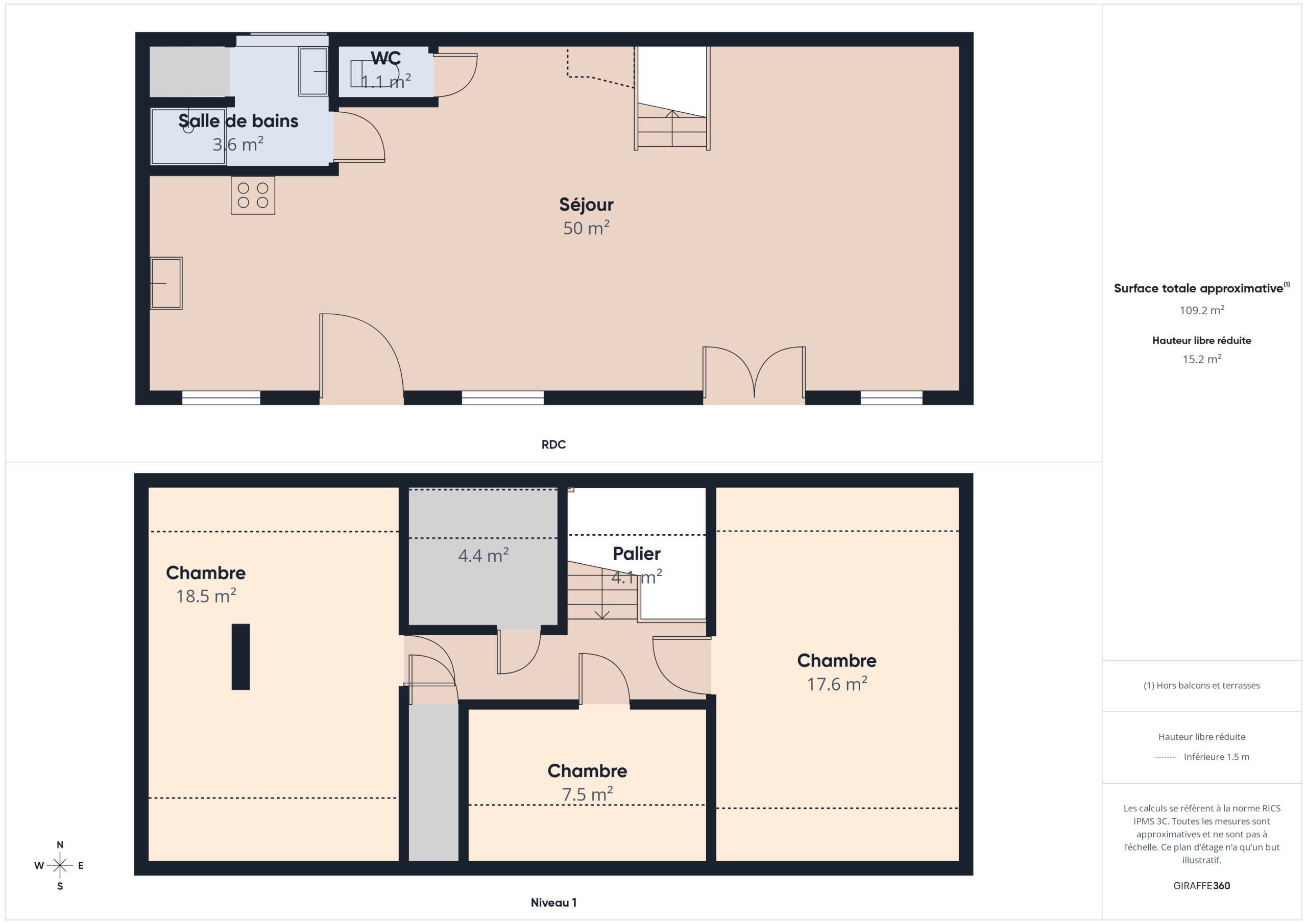 La salle de bain se situe au rez-de-chaussée et est équipée d’une douche, tandis que les WC sont séparés pour plus de confort.