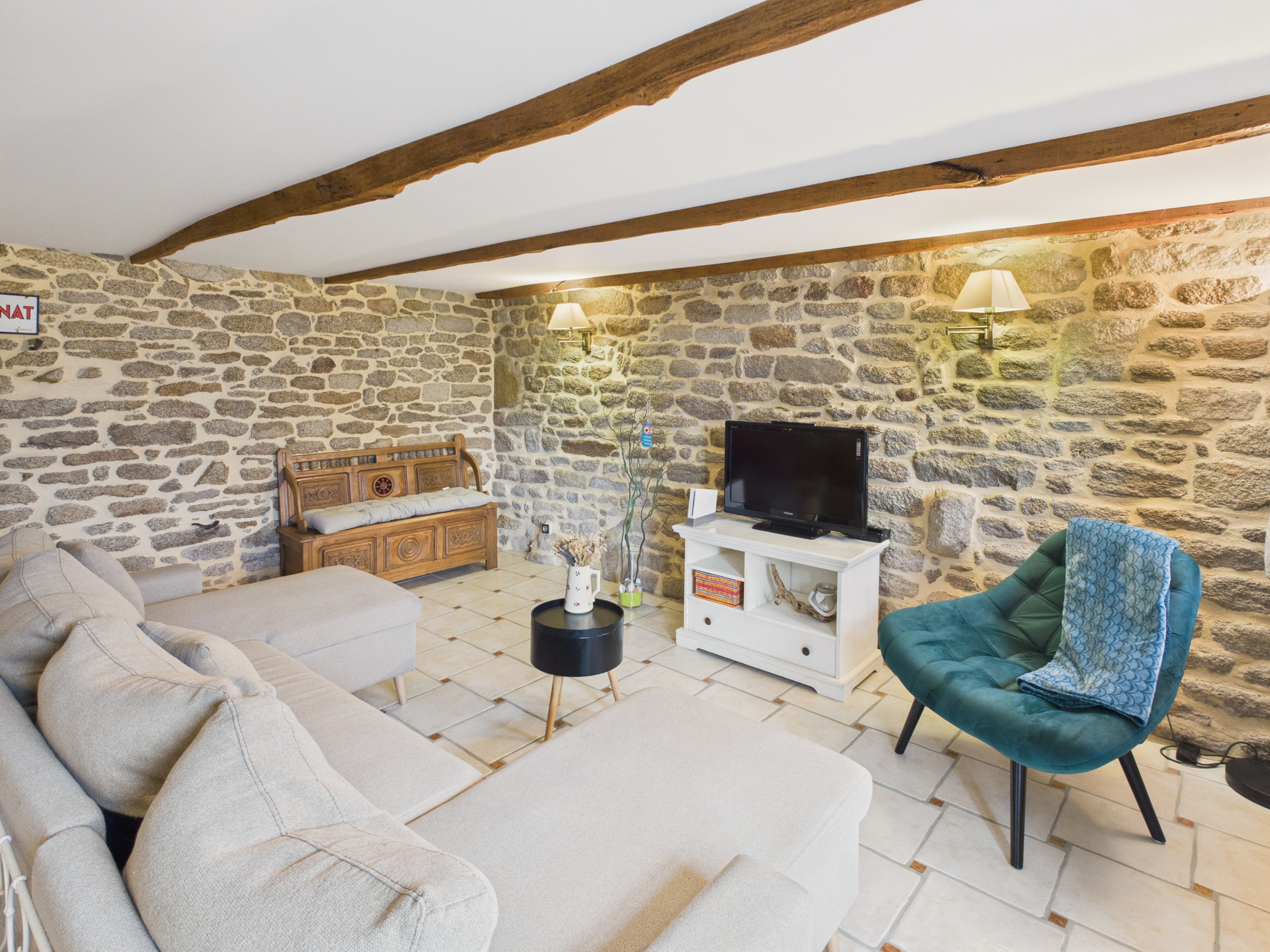 À l’intérieur, vous découvrirez une belle pièce de vie de 50 m² joliment décorée avec les pierres apparentes. La cuisine ouverte, entièrement équipée (réfrigérateur, congélateur, four, micro-ondes et plaques à gaz), vous offre tout le nécessaire pour préparer vos repas. Pour le petit-déjeuner, une bouilloire, un grille-pain et une cafetière à filtre sont également à votre disposition. Partagez vos repas autour de la table intérieure ou profitez de celle de la terrasse aux beaux jours. Le soir, installez-vous confortablement dans le coin salon, face à la télévision.