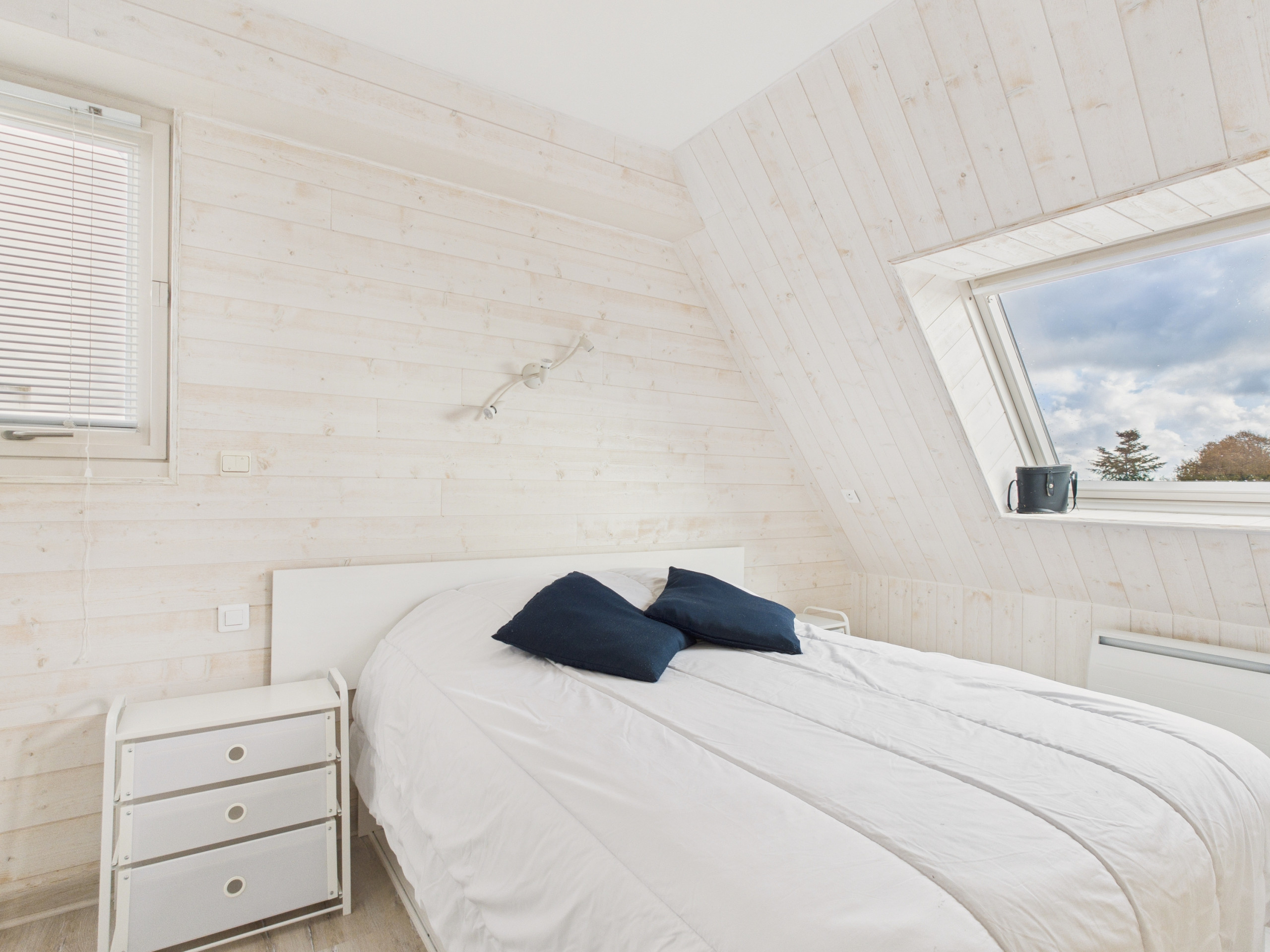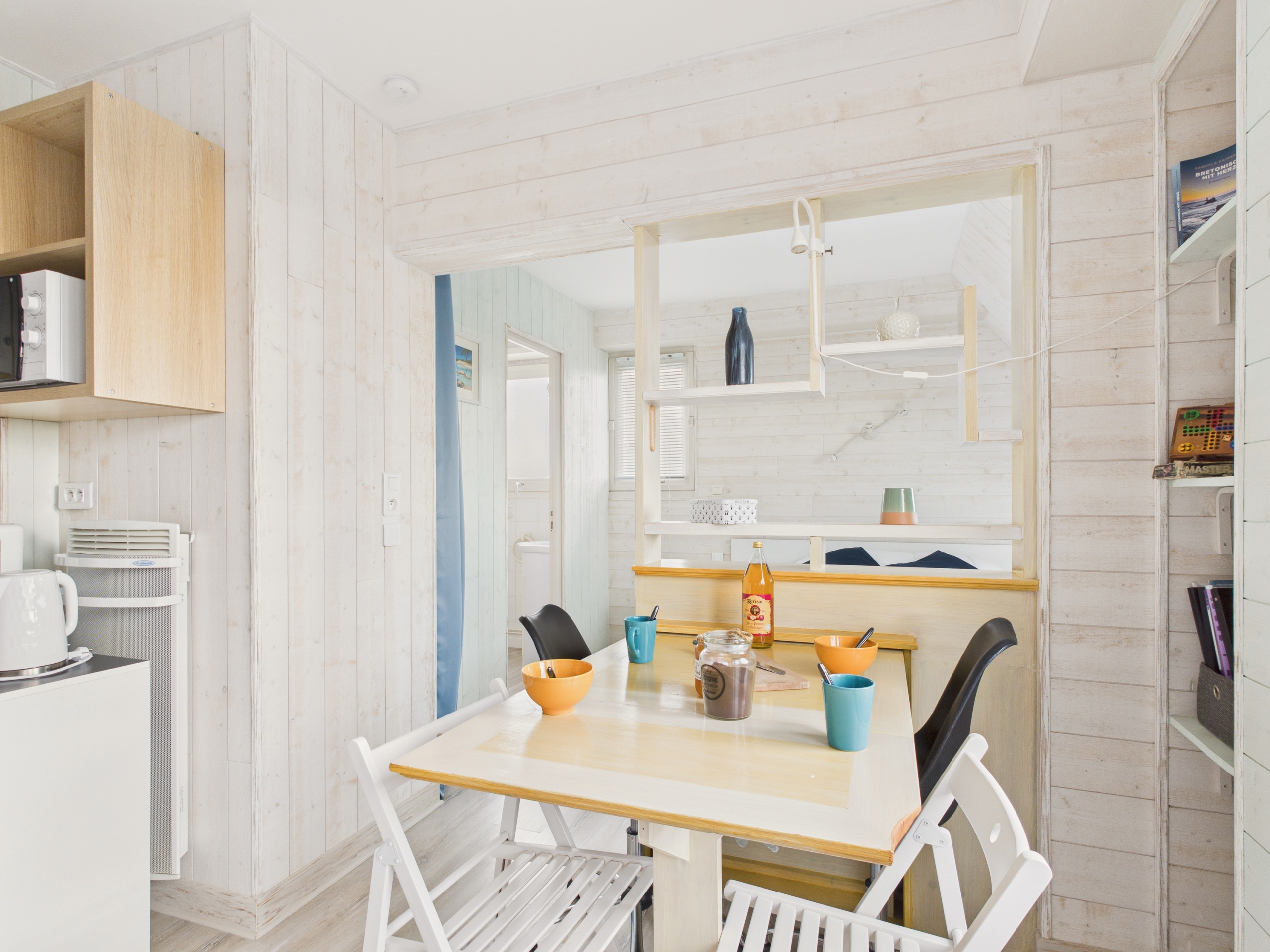 Un premier espace nuit, séparé de la pièce de vie par un rideau, est aménagé avec un lit double (140x190 cm), tandis que le canapé convertible du salon peut accueillir deux personnes supplémentaires.