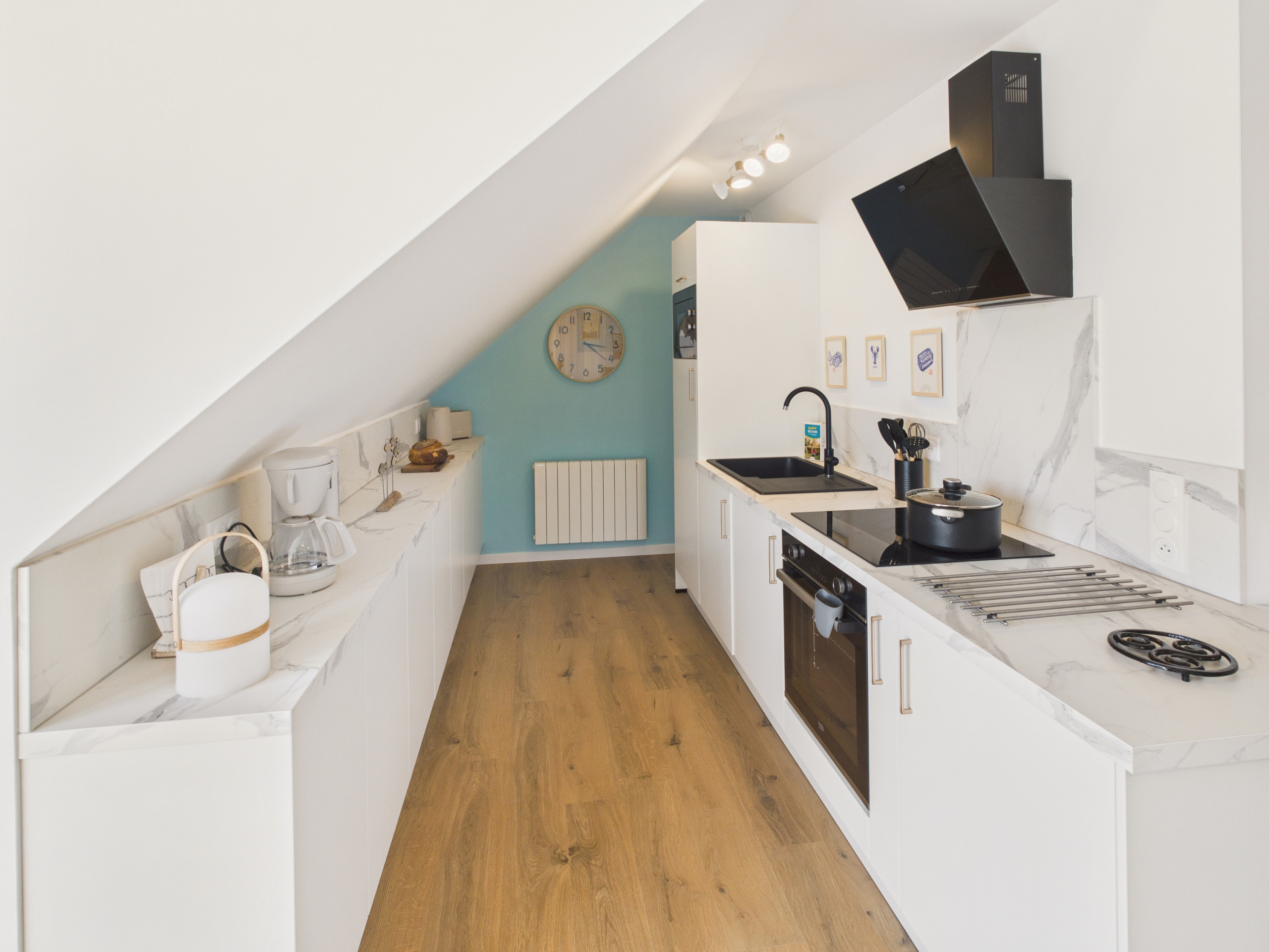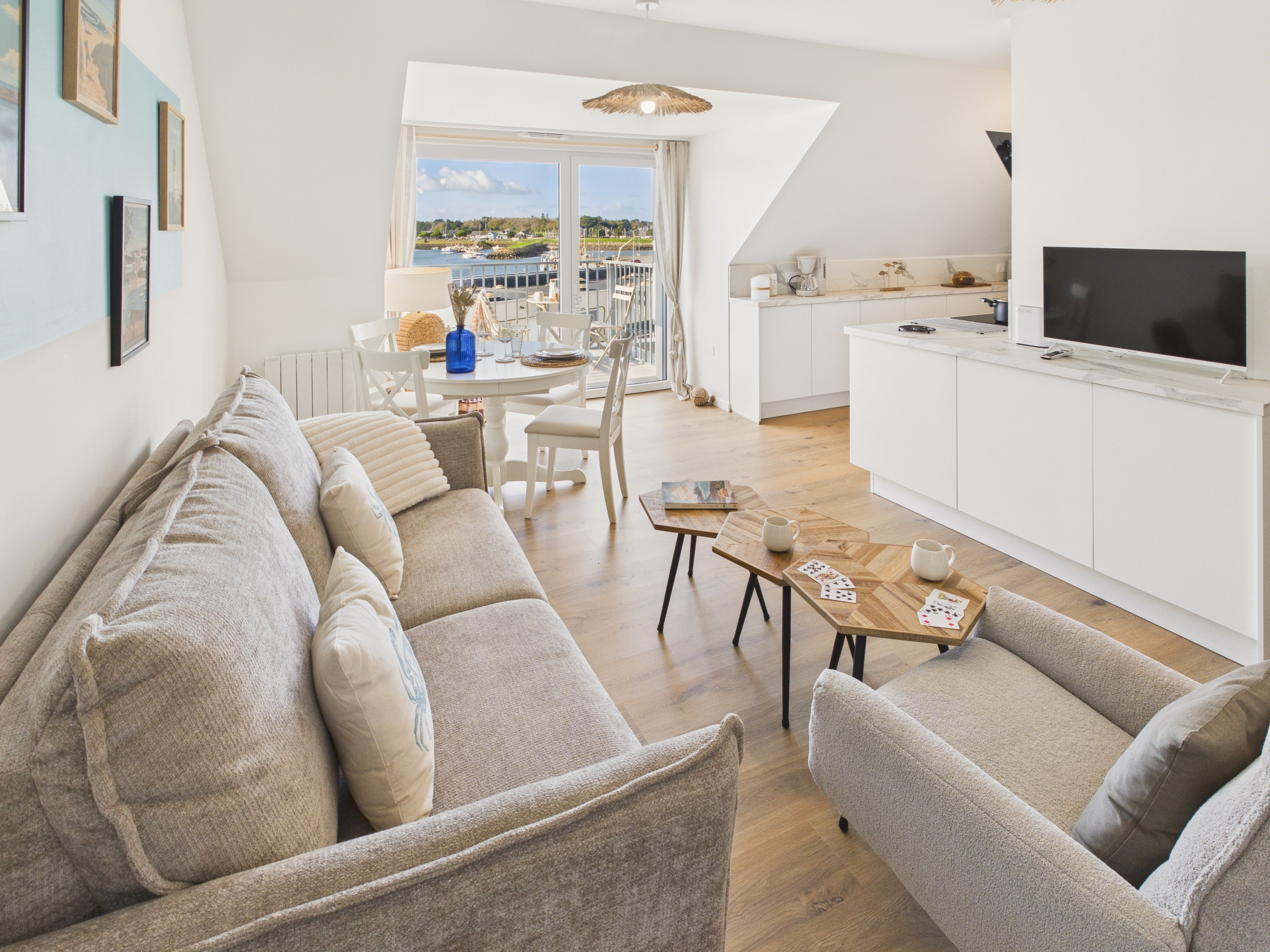 Passez la porte d’entrée et découvrez une belle pièce de vie moderne, joliment décorée, donnant accès à un balcon avec vue sur le port. La cuisine ouverte est entièrement équipée (réfrigérateur, four, micro-ondes, plaques à induction) et vous offre tout le nécessaire pour préparer vos repas. Pour le petit-déjeuner, une bouilloire, un grille-pain et une cafetière à filtre sont également à votre disposition. Partagez vos repas autour de la table à manger ou profitez de celle du balcon aux beaux jours. Côté détente, installez-vous confortablement dans le canapé face à la télévision.